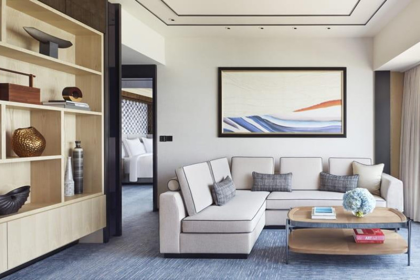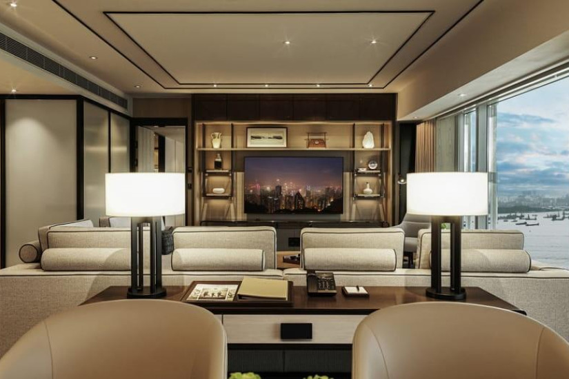 - 107 м2. Состоит из двух спален с кроватями king-size, гостиной, обеденной зоны, ванных комнат. Вид на бухту Виктория и полуостров Коулун. Доступ в представительский клуб. Максимальное размещение – 5 человек.