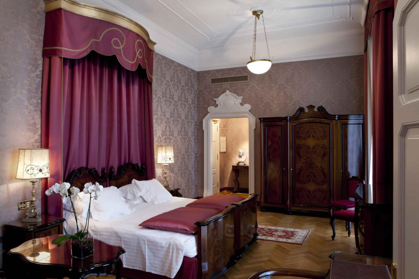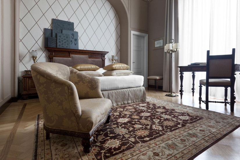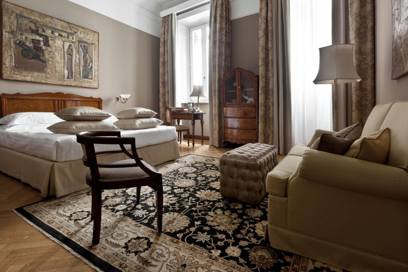 - 27 м2. Элегантный номер с видом на город или внутренний двор отеля, благодаря старинной мебели пронизан духом истории. Состоит из спальни с кроватью queen-size или двумя кроватями twin, зоны отдыха и ванной комнаты, отделанной мрамором. В ряде номеров возможно совмещение с Junior Suite.