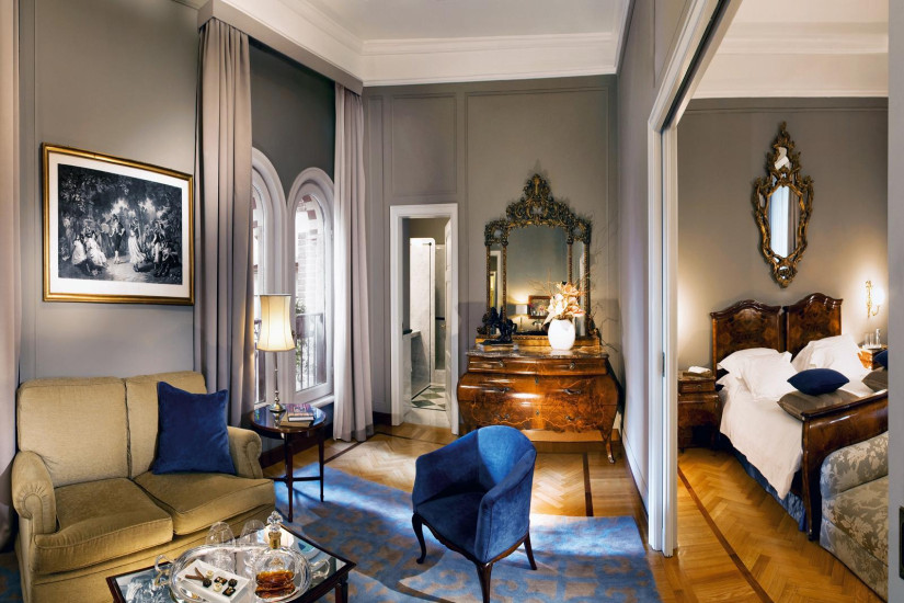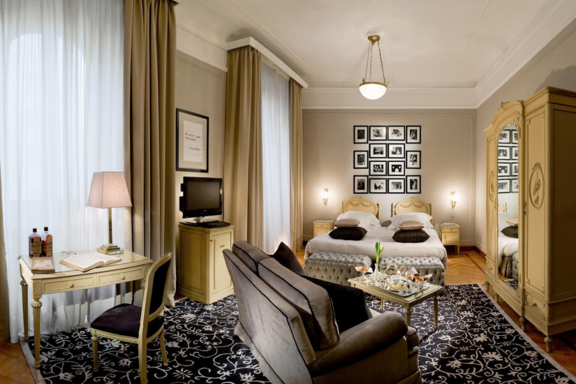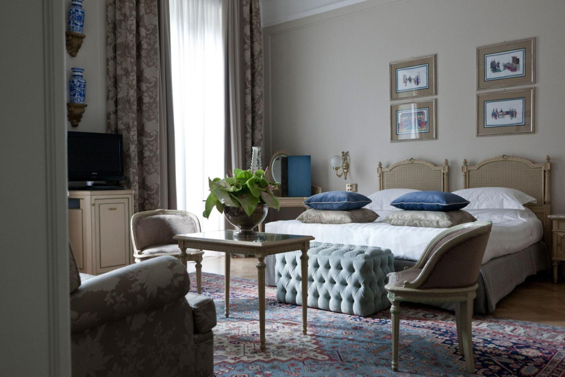 - 40 м2. Элегантный светлый номер с видом на город или внутренний двор отеля, в оформлении интерьера использована старинная мебель и произведения искусства. Состоит из спальни с кроватью king-size или двумя кроватями twin, гостиной зоны и ванной комнаты, отделанной мрамором. В ряде номеров возможно совмещение с Superior и Deluxe room.