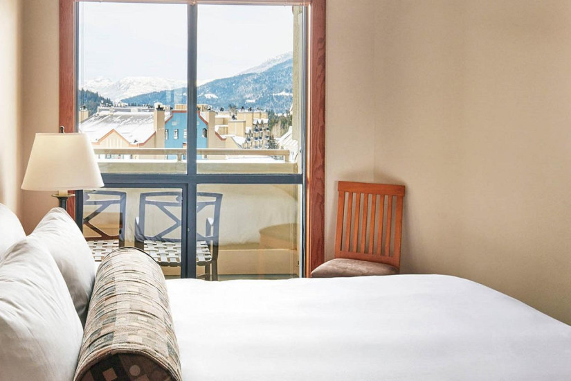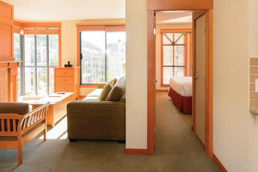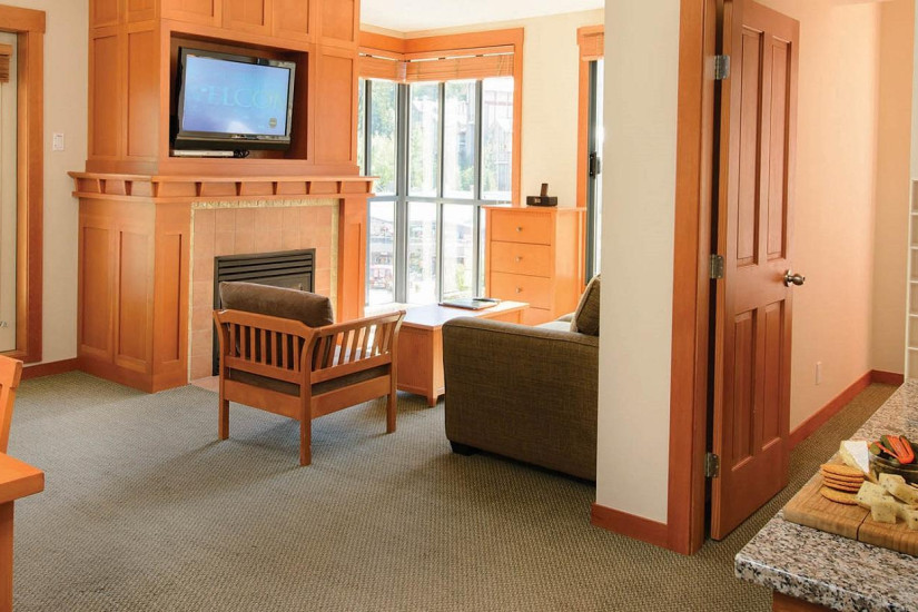 - 75 м2. Состоит из двух спален, в одной спальне кровать king size, во второй кровать queen size, гостиной комнаты с камином, полностью оборудованной кухни с обеденной зоной, двух ванных комнат, балкона. Номер расположен на нижних этажах с видом на долину и деревню Whistler Village.