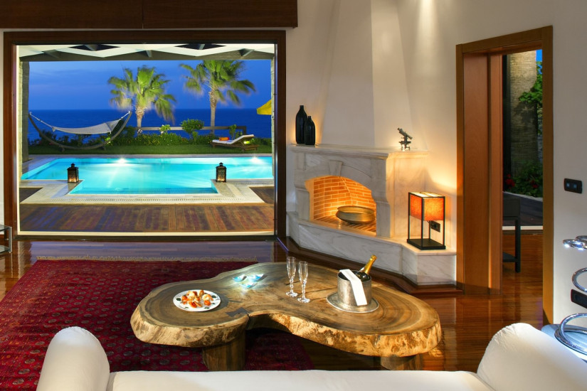 - 85 м2. Прекрасная спа-вилла с собственным бассейном с подогревом расположена на берегу моря и предлагает захватывающие дух виды на бесконечное прозрачное голубое Ионическое море. Вилла состоит из просторной главной спальни с кроватью king-size, красиво декорированной гостиной зоны открытой планировки с кухней, отдельной гостиной с диваном, письменным столом и персональным компьютером. Смежная со спальней просторная ванная комната отделана мрамором и оборудована джакузи, а также отдельной душевой кабиной с гидромассажем. Максимальное размещение – 4 человека.