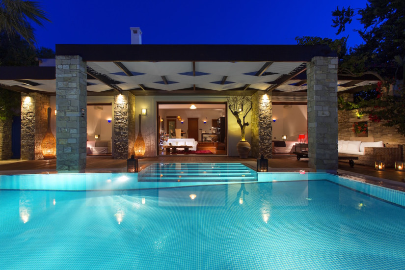 - 370 м2. Роскошная двухуровневая вилла с потрясающими панорамными видами на залив расположена на берегу моря и имеет собственный участок пляжа с персональными шезлонгами и зонтом для полного уединения. Она идеально подходит для больших семей или групп друзей. Состоит из четырех спален со смежными гостиными зонами, четырех ванных комнат, отделанных мрамором, террасы с бассейном с подогревом и ландшафтного сада с обеденной зоной. Максимальное размещение – 14 человек.