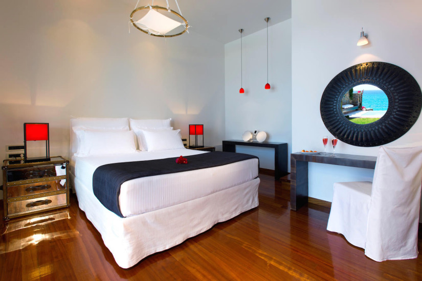 - 120 м2. Вилла с изумительными видами на море и соседние острова расположена на берегу моря и имеет собственный участок пляжа с персональными шезлонгами и зонтом для полного уединения. Вилла состоит из вестибюля, спальни с кроватью king-size, двух ванных комнат, отделанных мрамором и оборудованных джакузи и отдельной душевой кабиной с гидромассажем, гардеробной комнаты, роскошно декорированной гостиной и столовой зоны, рабочей зоны и большой, полностью оснащенной кухни. Вилла имеет собственный огороженный дворик. Максимальное размещение – 4 человек.