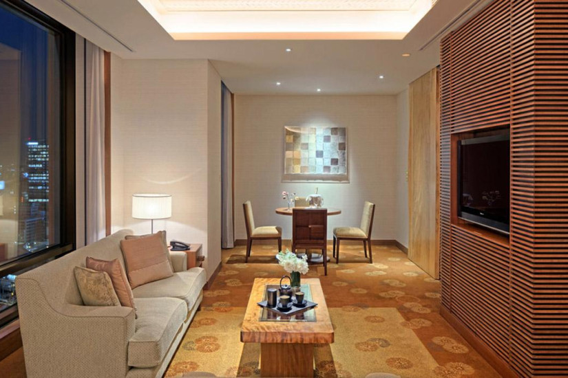 - 81 м2. Состоит из спальни с кроватью king-size и двумя кроватями twin, гостиной, обеденной зоны на 4 человек, гардеробной, ванной комнаты, гостевой туалетной комнаты. Вид на квартал Ginza.