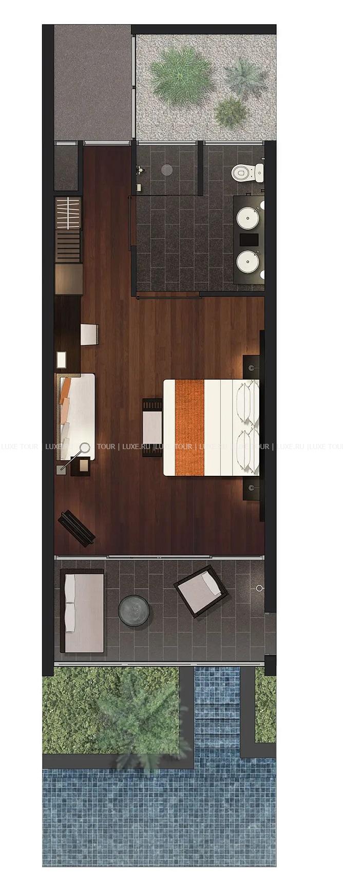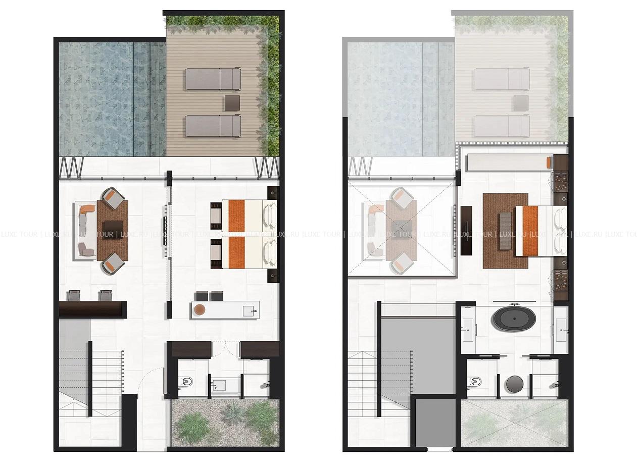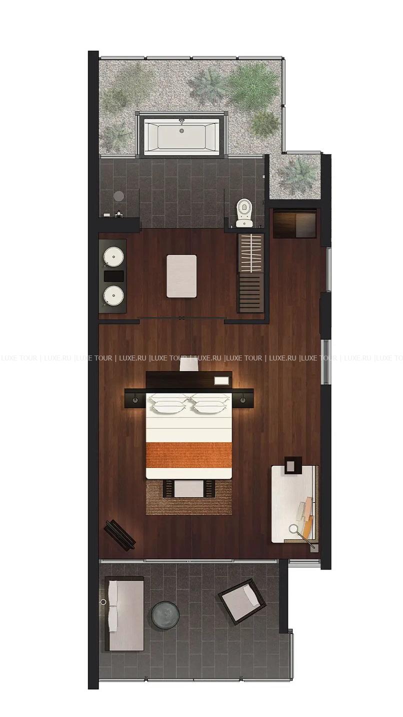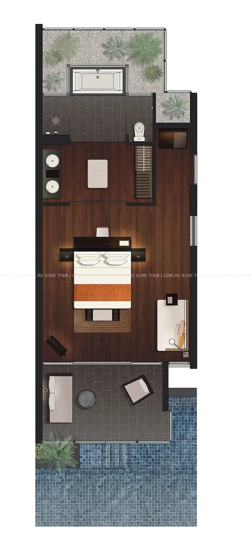 - 65 м2. Состоит из спальни с кроватью king-size или двумя кроватями twin, зоны отдыха, ванной комнаты, меблированной террасы c выходом к бассейну-лагуне. Максимальное размещение – 2 человека.