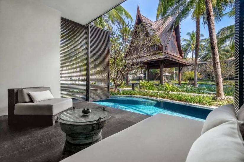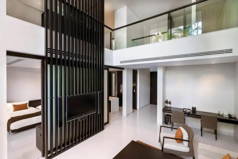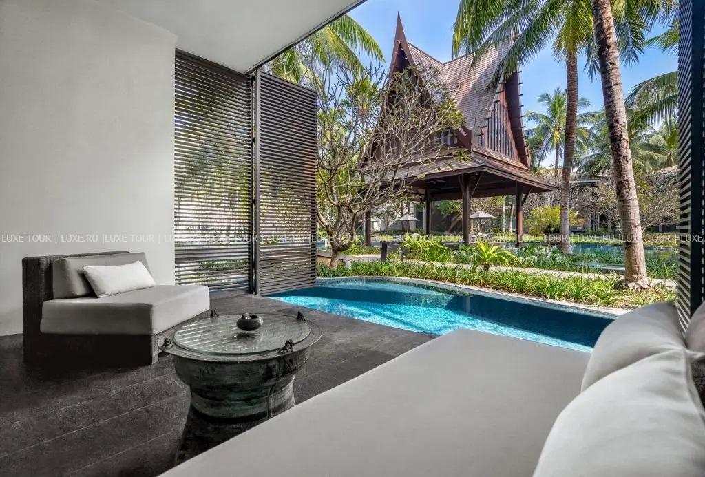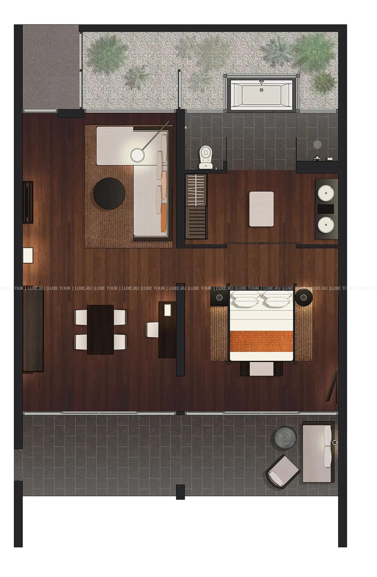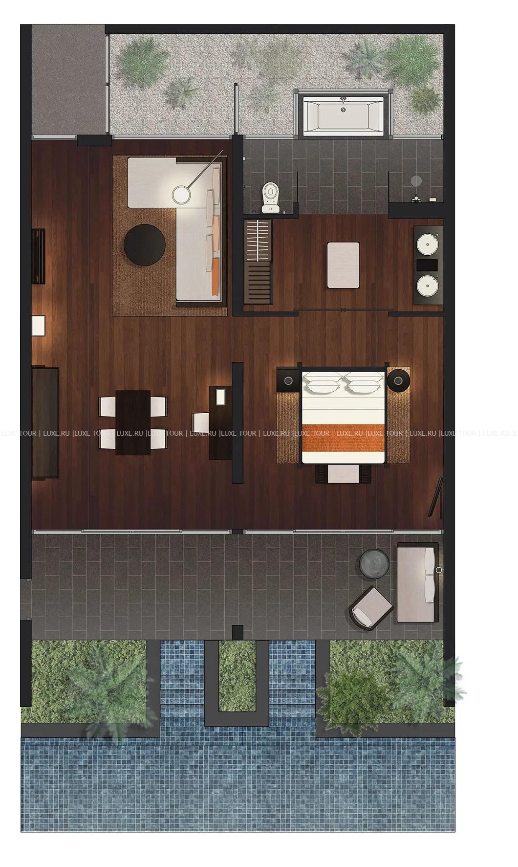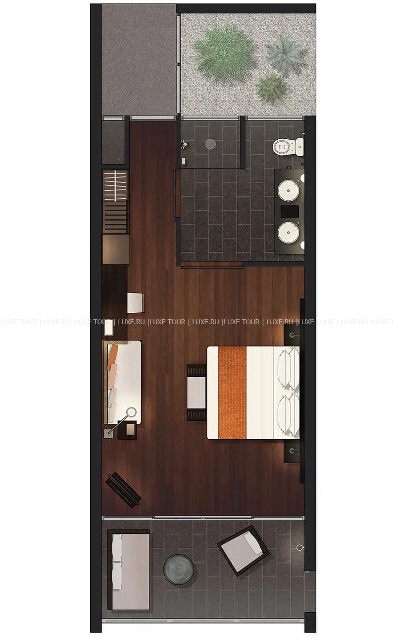 - 65 м2. Состоит из спальни с кроватью king-size или двумя кроватями twin, зоны отдыха, ванной комнаты, меблированной террасы c выходом к бассейну-лагуне. Максимальное размещение – 2 человека.