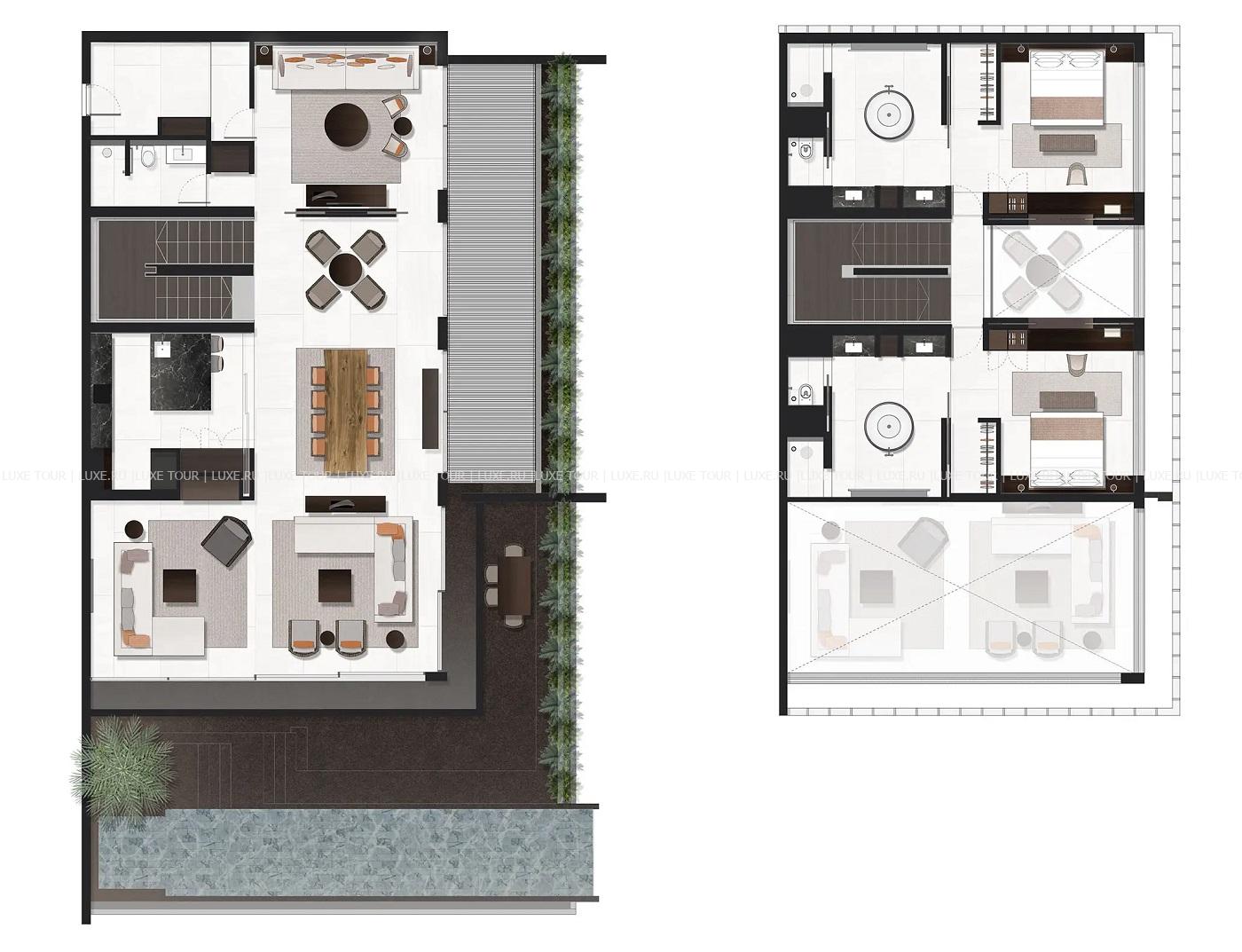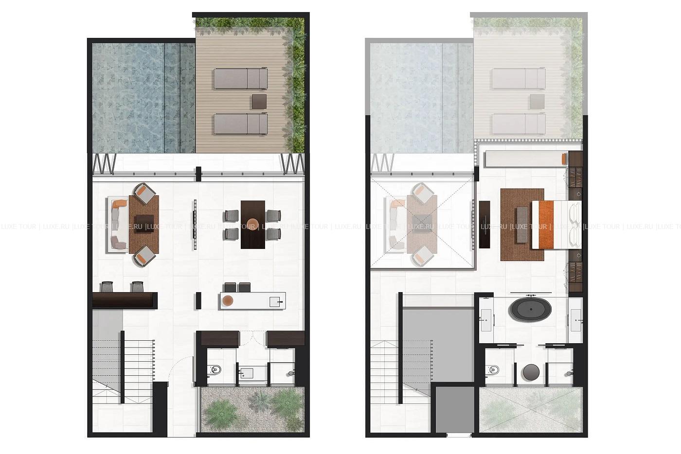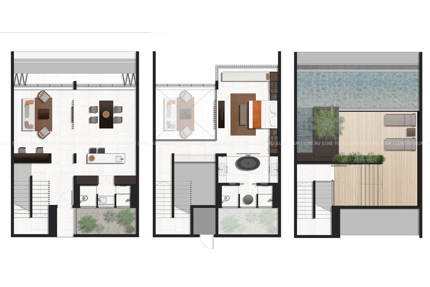 - 190 м2. Двухуровневый лофт, состоит из двух спален с кроватью king-size и двумя кроватями twin, гостиной с обеденной зоной, ванной комнаты, меблированной террасы с бассейном. Максимальное размещение – 4 человека.