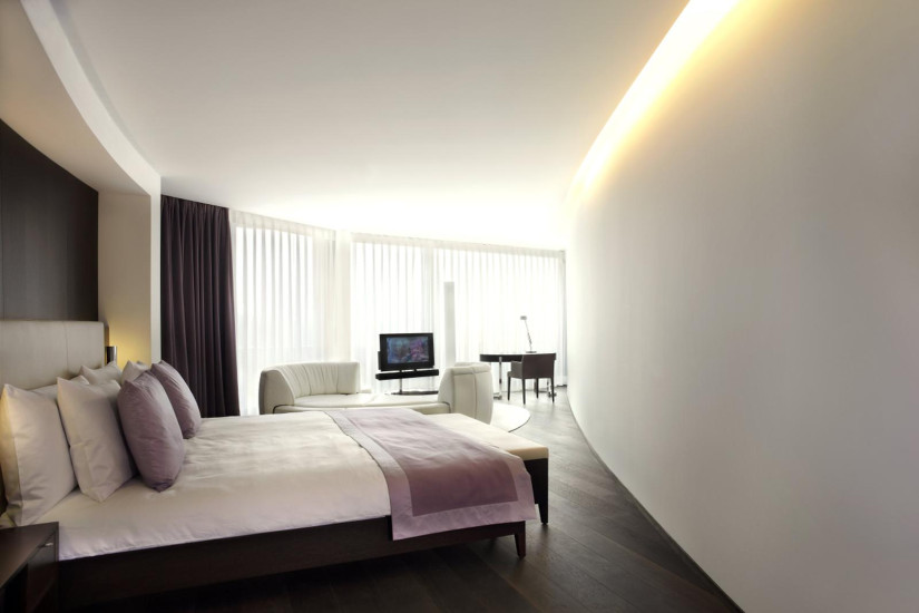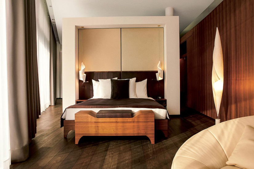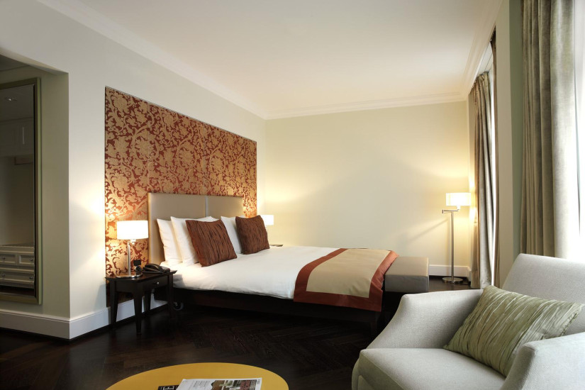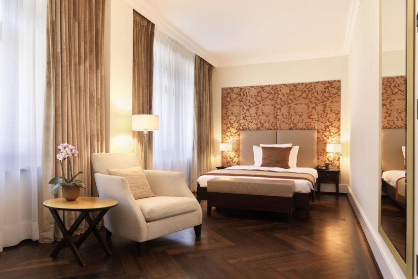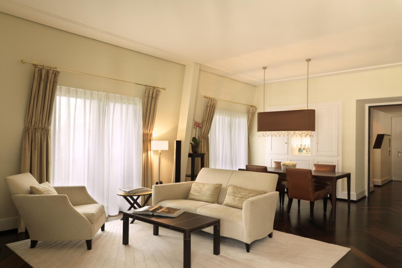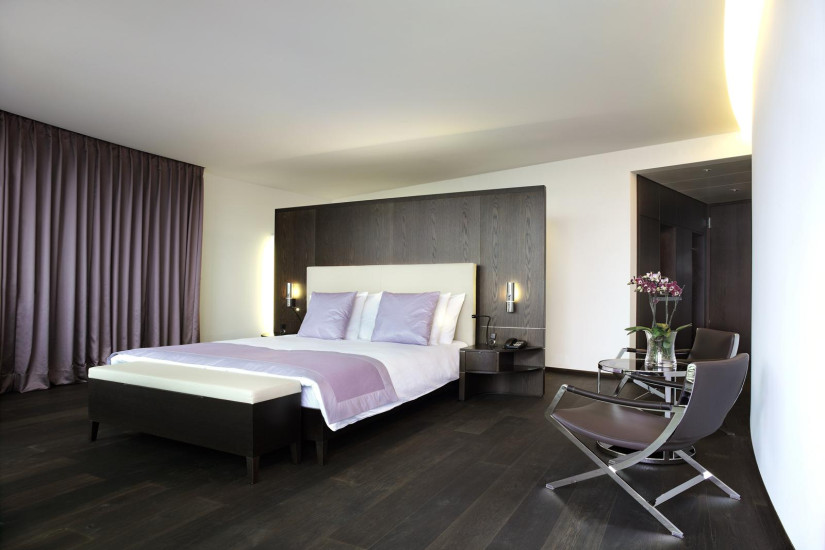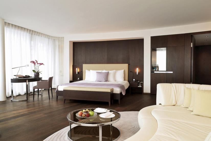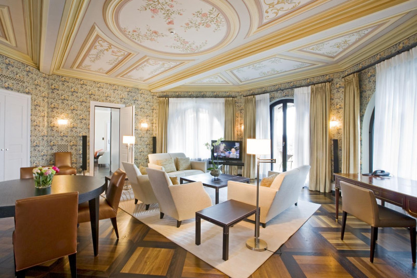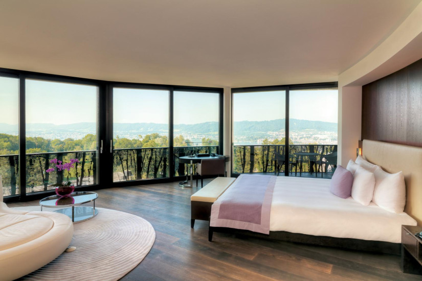 - 100 м2. Состоит из спальни, гостиной, ванной комнаты с джакузи, балкона или эркера с панорамным видом на Цюрих, озеро и Альпы. Возможно присоединение до 3 номеров категории Double Room Deluxe. Номера располагаются в главном здании.