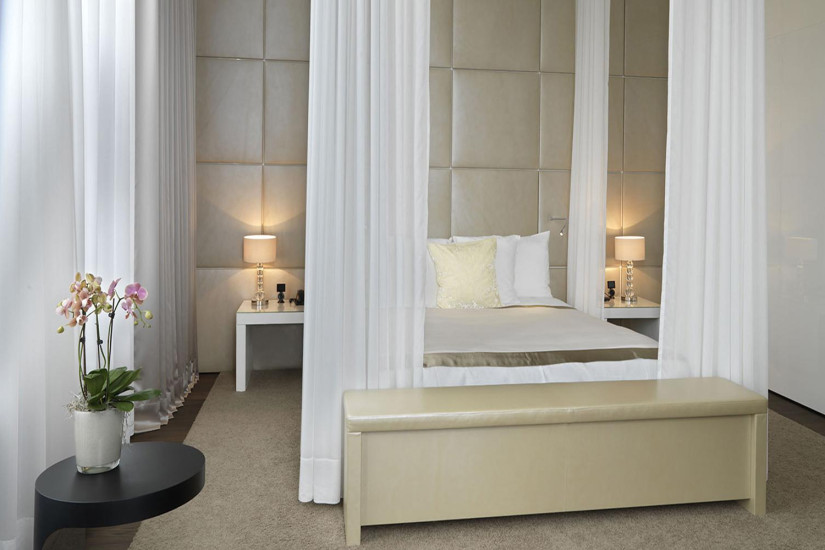 - 104 м2. Состоит из спальни, гостиной, ванной комнаты с джакузи и сауной, лестница ведет на верхний этаж с гостиной и террасой на крыше с панорамным видом на Цюрих, озеро и Альпы. В спальне и гостиной есть камин и балкон. Номера располагаются в главном здании.