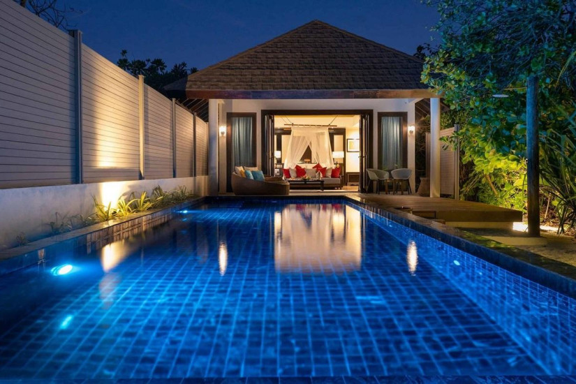 - 242 м2. Состоит из спальни с кроватью king-size, гостиная c диваном и центральным столом, а также рабочий стол. Просторный гардероб с бесплатными принадлежностями для пляжного отдыха, включая солнцезащитный крем, лосьон от насекомых, зонтики, халаты и тапочки. Роскошная ванная комната под открытым небом с тропическим душем в помещении, гидромассажная ванна на открытом воздухе и просторный мраморный туалетный столик. Частный пляж, сад и веранда, бассейн 42 м2 . Крытые столики на открытом воздухе, беседка с качелями, кушетка, стулья и шезлонги. Прямой выход на пляж. Максимальное размещение - 3 взрослых +1 ребенок.