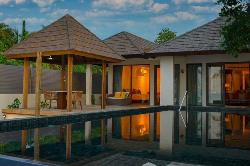 - 126 м2. Состоит из спальни с кроватью king-size и зоной отдыха, ванной комнаты открытого плана с ванной и душем, террасы с бассейном (20 м2), зоной отдыха, обеденной зоной, спуском в воду и видом на океан. Виллы расположены на сваях в лагуне в северной части острова. Максимальное размещение – 3 взрослых + 1 ребенок или 2 взрослых + 2 ребенка.