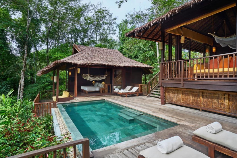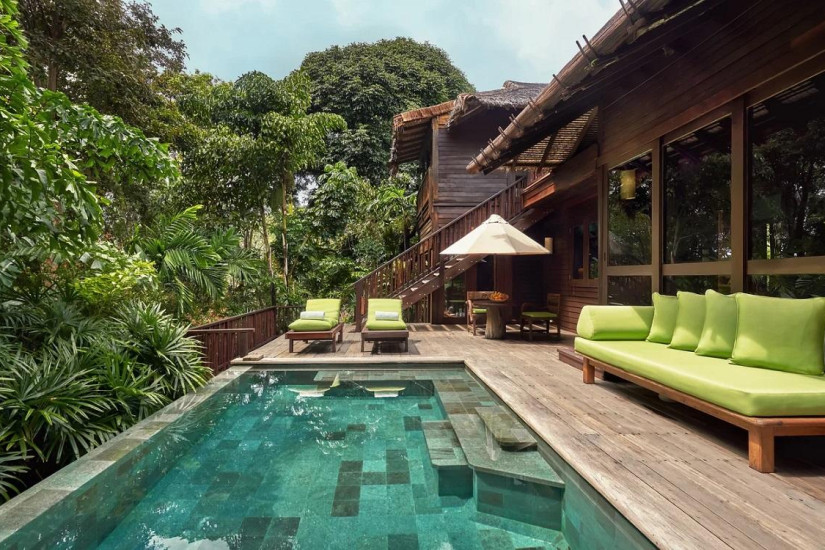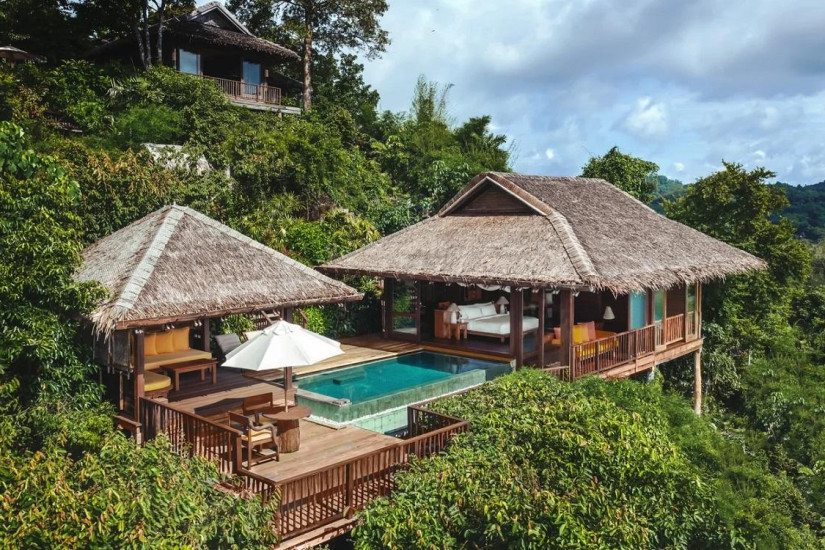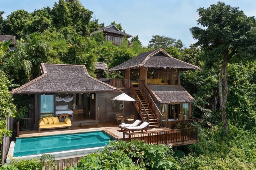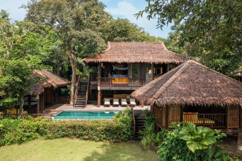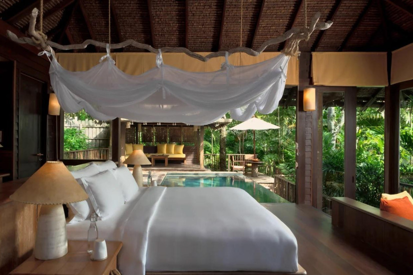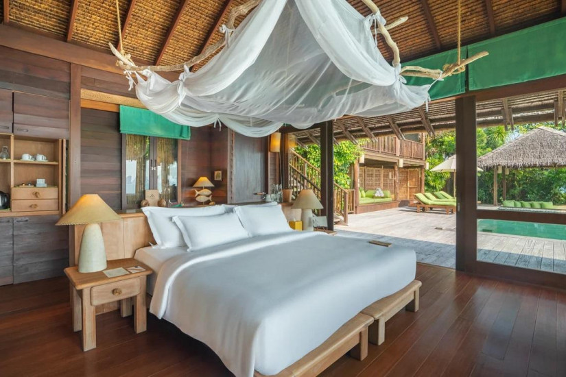- 228 м2. Двухуровневая вилла, состоит из спальни, гостиной, гардеробной, ванной комнаты, террасы с обеденной зоной и шезлонгами, бассейна. Прямой доступ к пляжу через сад. Вид на океан. Максимальное размещение — 5 человек.