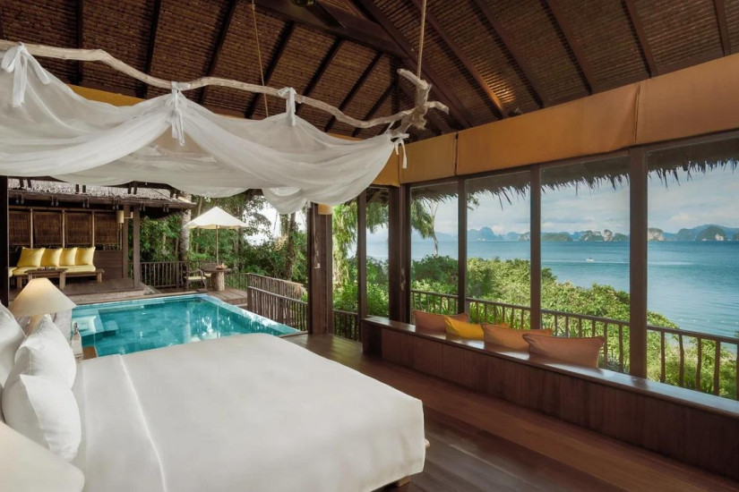 - 154 м2. Состоит из спальни, гостиной, ванной комнаты, террасы с шезлонгами и обеденной зоной на открытом воздухе, бассейна. Панорамный вид на океан. Максимальное размещение — 3 человека.