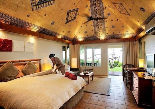 Outrigger Fiji Beach Resort — один из лучших курортов, расположенных на юге Тихого океана. Раскинувшись на площади в 40 акров, на спокойном коралловом побережье острова Вити Леву, курорт своим архитектурным решением и гостеприимством напоминает традиционную фиджийскую деревню. И в то же время в комфортабельных номерах и бунгало есть кондиционеры и все удобства современной цивилизации. Бунгало с крышами из тростника и сводчатыми потолками внутри покрыты особой материей "тапа", изготовленной из луба местного дерева "бумажной шелковицы", и раскрашены вручную местными мастерами. Для гостей номеров Deluxe Ocean View Rooms, Suites и Bures предлагаются услуги дворецкого.