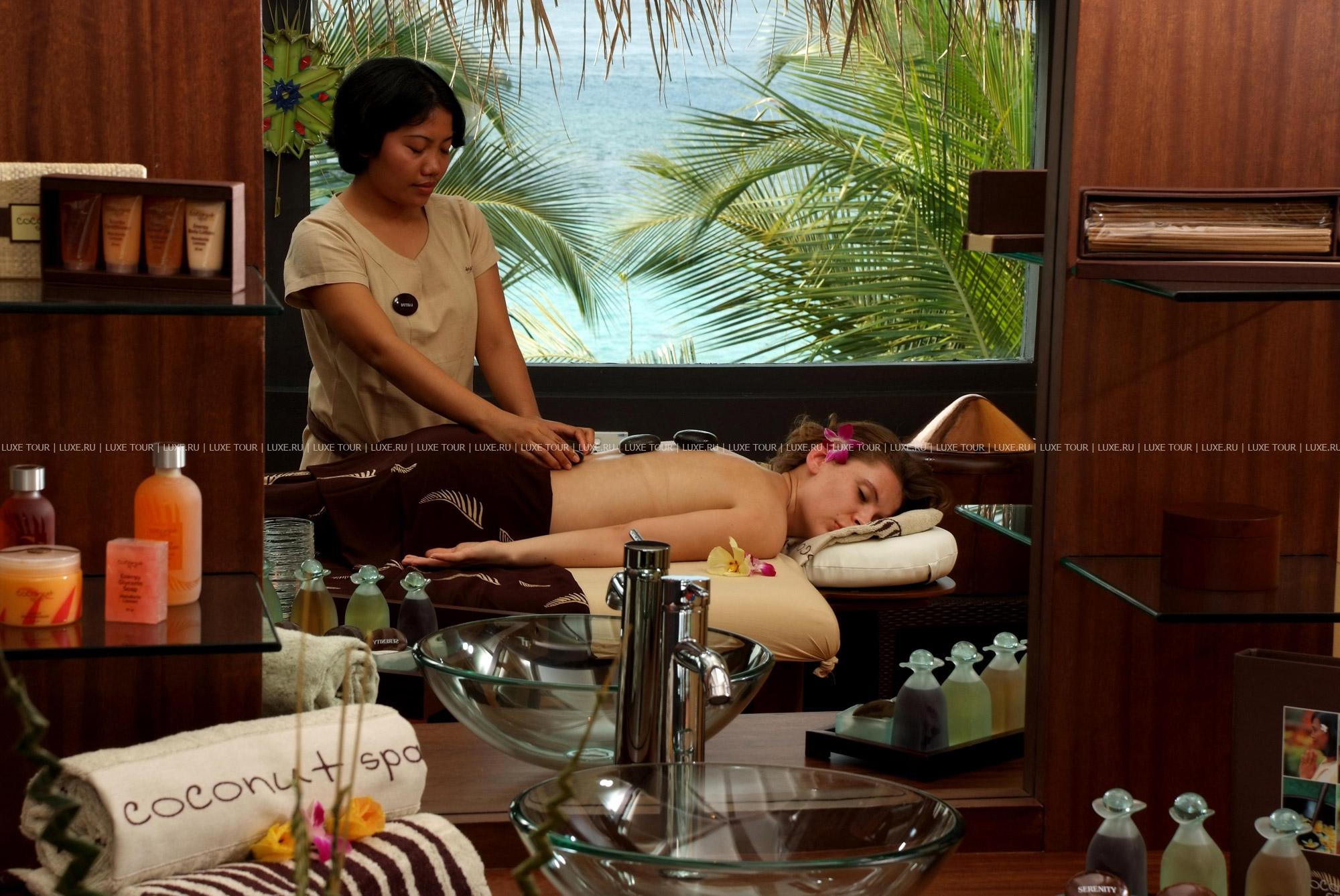 К услугам гостей отеля — великолепный центр Coconut Spa площадью 200 м2, включающий: 2 процедурных кабинета на двоих с гидромассажной ванной, 2 процедурных кабинета на двоих с ароматическими цветочными ваннами, сауну, кабинет для косметологических процедур, студию маникюра и спа бутик. Квалифицированные специалисты центра предлагают широкий спектр различных услуг по уходу за лицом и телом, включая рефлексологию, балийский массаж, а также процедуры, основанные на азиатских и французских методиках.