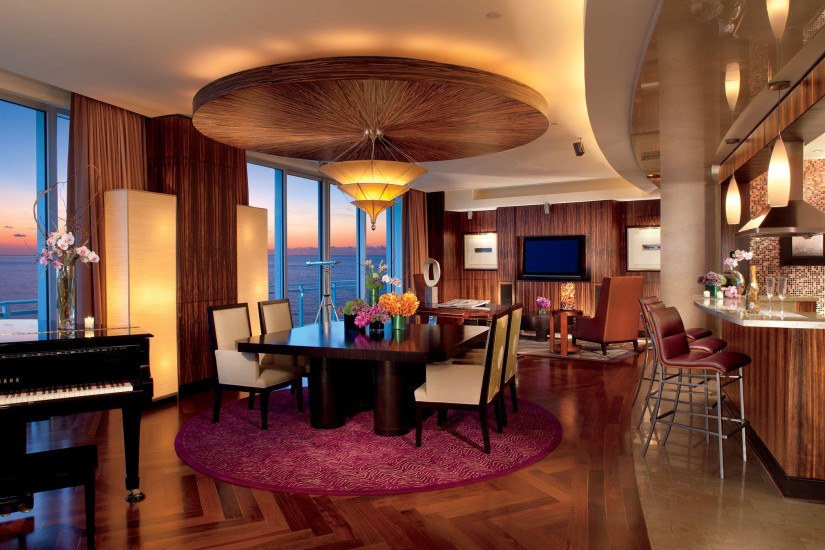 - 262 м2. Роскошный номер с отдельным входом и персональным лифтом, расположен на 18 этаже, включает спальню с кроватью king-size, гостиную с роялем, зону отдыха с домашним кинотеатром, обеденную зону на 8 персон, современно оборудованную кухню, винный бар с 46 бутылками изысканных вин, ванные комнаты (в главной имеется сауна, ванна в романском стиле и гидромассажный душ), 4 террасы с захватывающим панорамным видом на океан. Гостям номера предоставляются VIP-услуги.