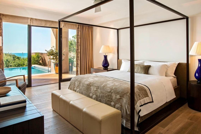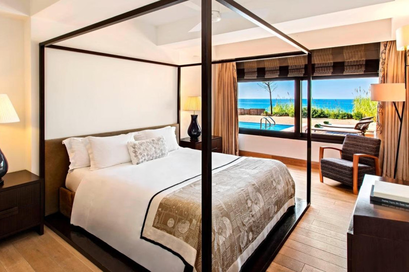 - 82 м2. Состоит из спальни с кроватью king-size и гидромассажной ванной у окна, гостиной с обеденной зоной, зоной отдыха с диваном и домашним кинотеатром, ванной комнаты с душем, в некоторых номерах балкон или терраса с персональным бассейном (23-35 м2), зоной отдыха, открытым камином и фронтальным видом на море. Номера расположены рядом с пляжем. Максимальное размещение – 4 взрослых или 3 взрослых + 2 ребенка.