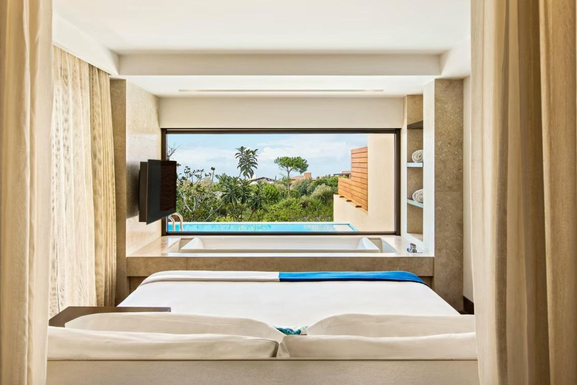 - 43 м2. Состоит из спальни с кроватью king-size или двумя кроватями twin и зоной отдыха с диваном, ванной комнаты с ванной и душем, в некоторых номерах терраса с персональным бассейном (23 м2), зоной отдыха и видом на море. Максимальное размещение – 3 взрослых или 2 взрослых + 1 ребенок.