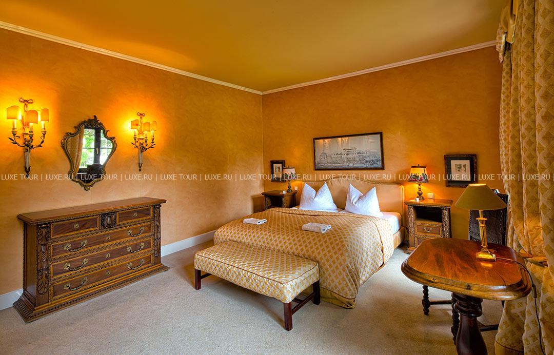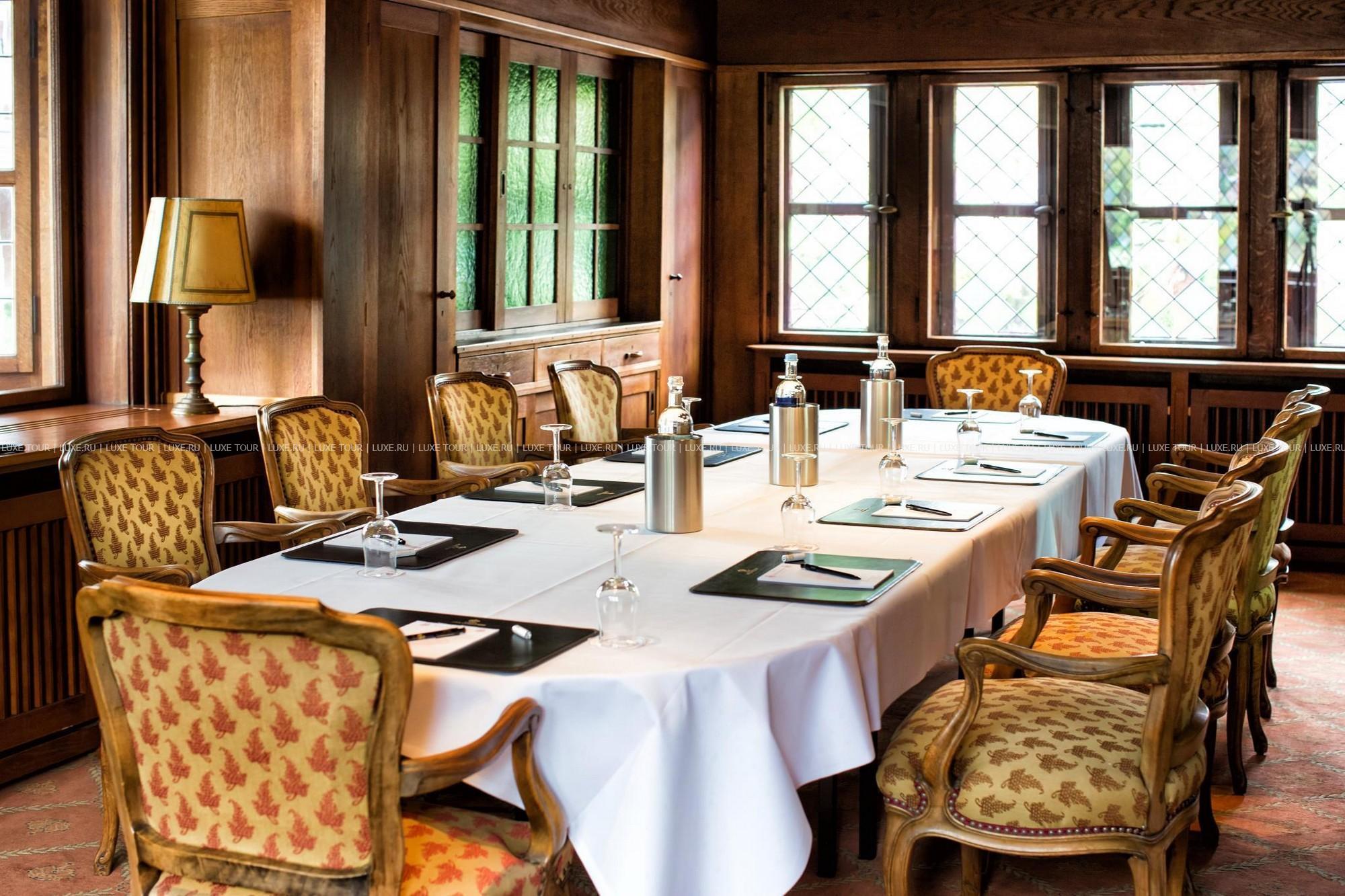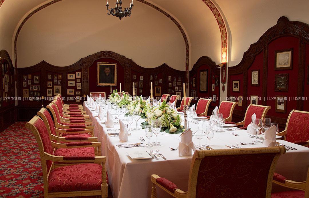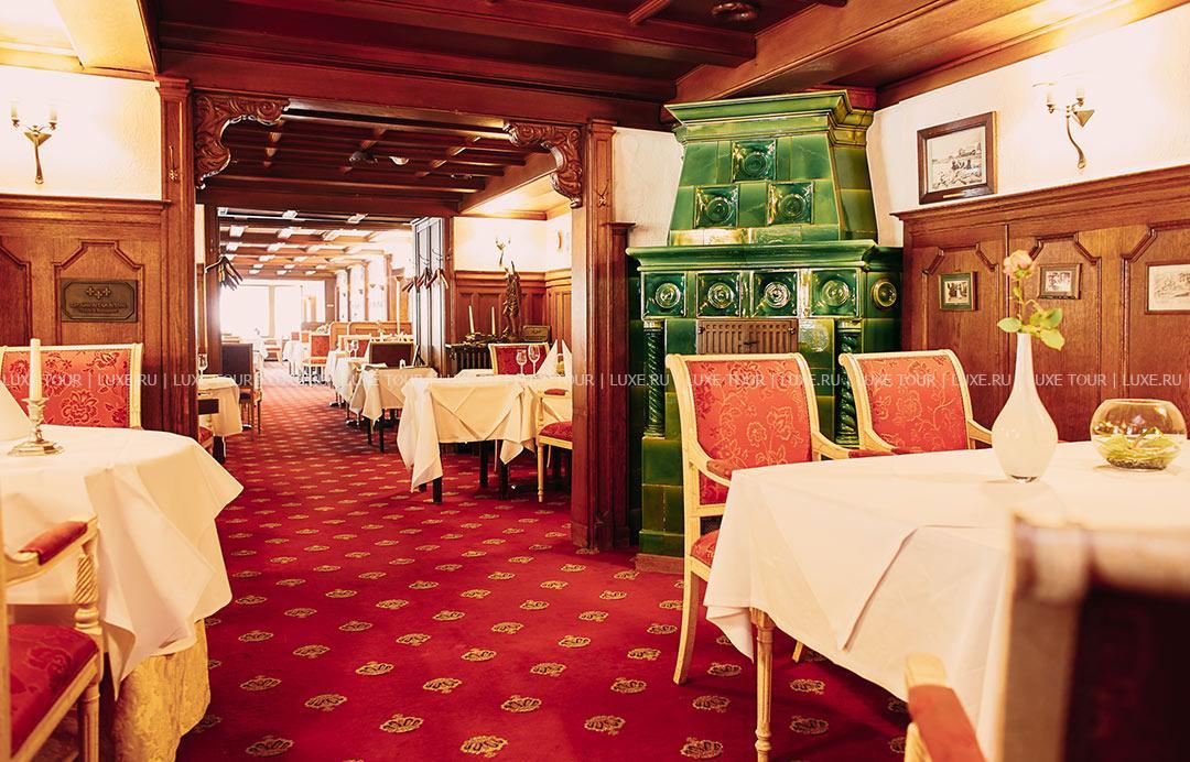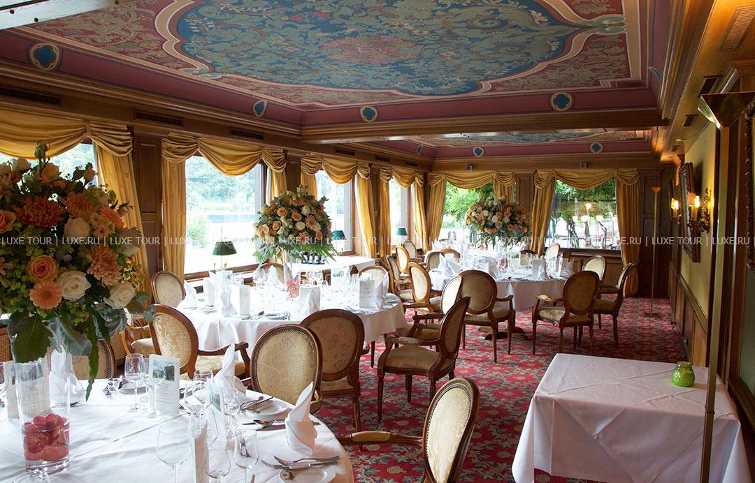 В элегантном ресторане отеля, обшитом старинными дубовыми панелями, предлагается разнообразие блюд региональной и интернациональной кухонь, деликатесы классической французской и современной немецкой кухни, а также сезонное меню. Прекрасное дополнение к изысканной кухне — превосходные вина из винного погреба отеля, включая вина с местных виноградников.