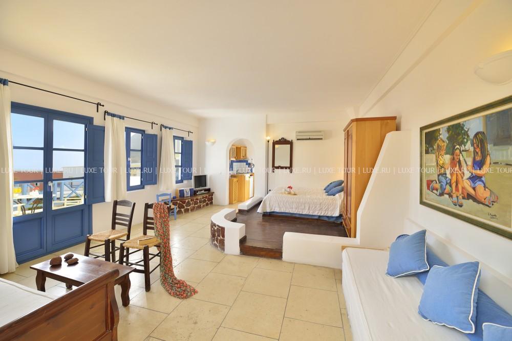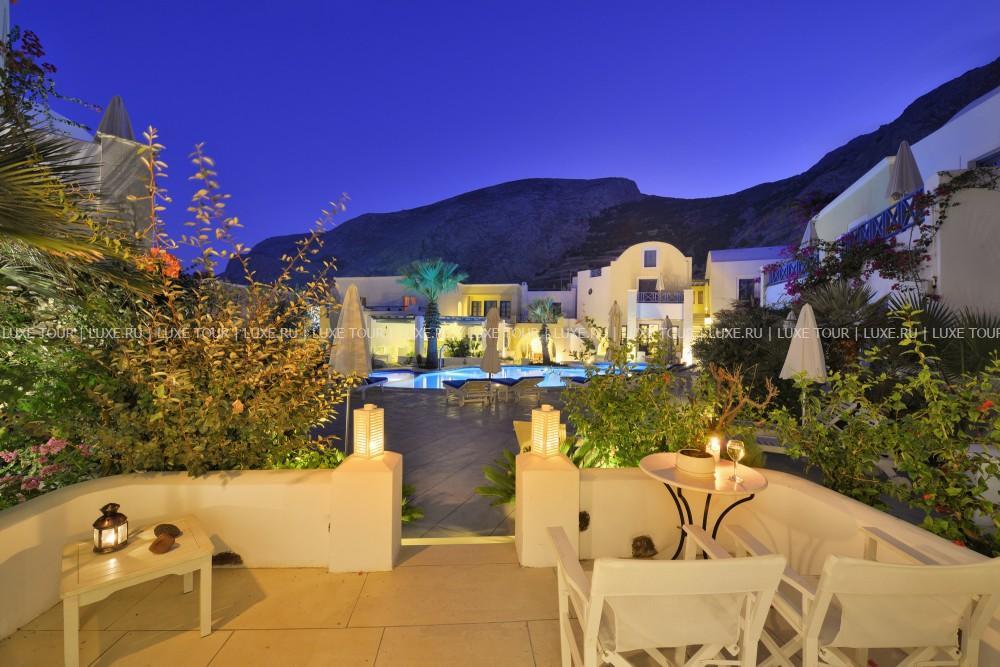 Отель расположен в восточной части острова Санторини – в прибрежной деревушке Камари (1400 жителей), в 8 км от столицы острова – города Фиры, в 4 км от аэропорта, в 8 км от порта. Автобусная остановка находится в 30 м от отеля.
