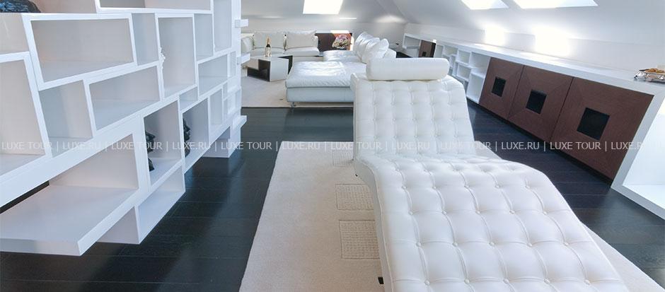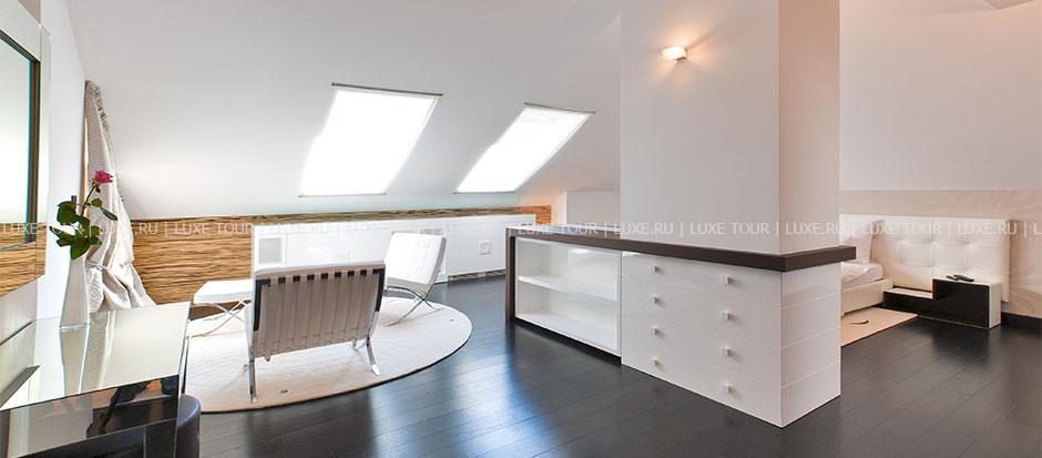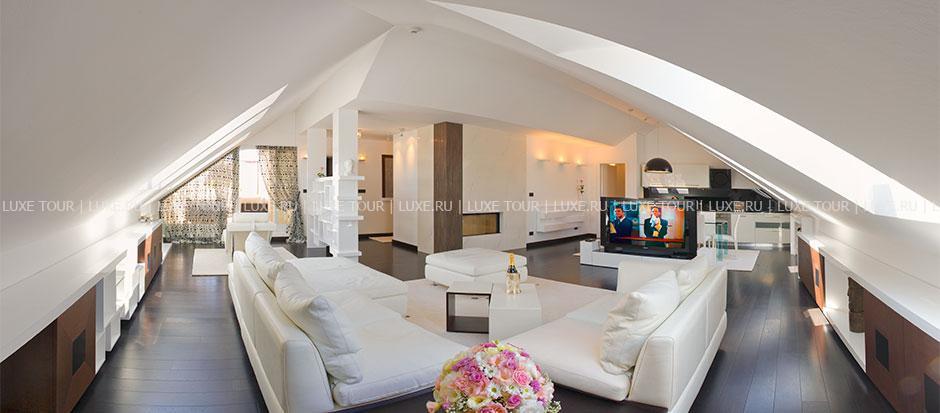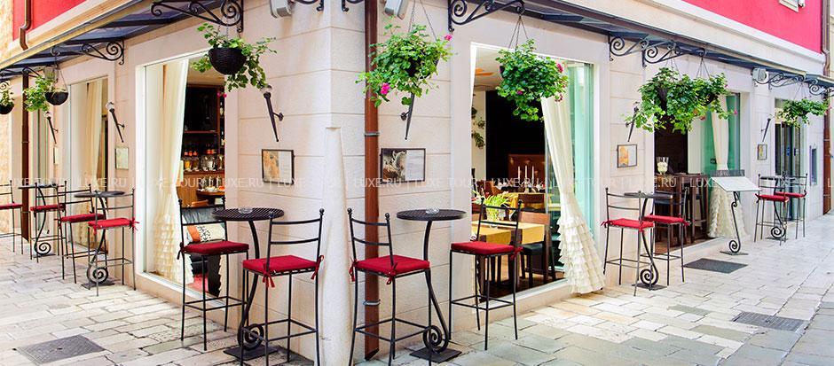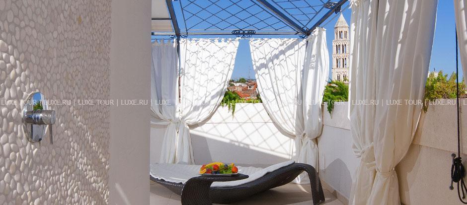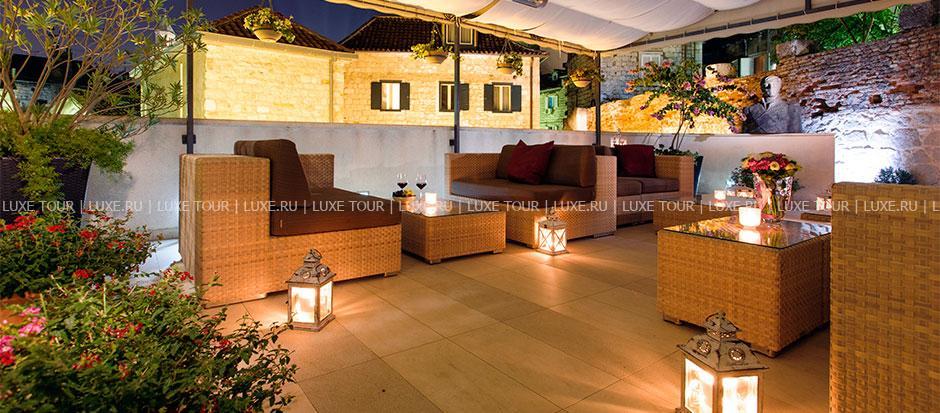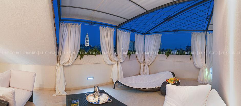 Открытая терраса с удобными глубокими креслами — прекрасное место для отдыха, откуда можно любоваться уникальной архитектурой исторического центра Сплита.