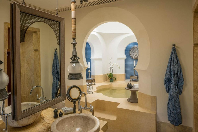 - 68 м2. Состоит из спальни с кроватью king-size, гардеробной, ванной комнаты с ванной в стиле хаммама и душем, в некоторых номерах большой балкон с зоной отдыха, обеденной зоной и видом на сад. Номера расположены на верхнем этаже. Максимальное размещение – 3 взрослых или 2 взрослых + 2 ребенка.