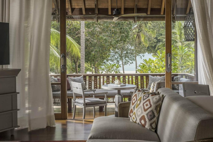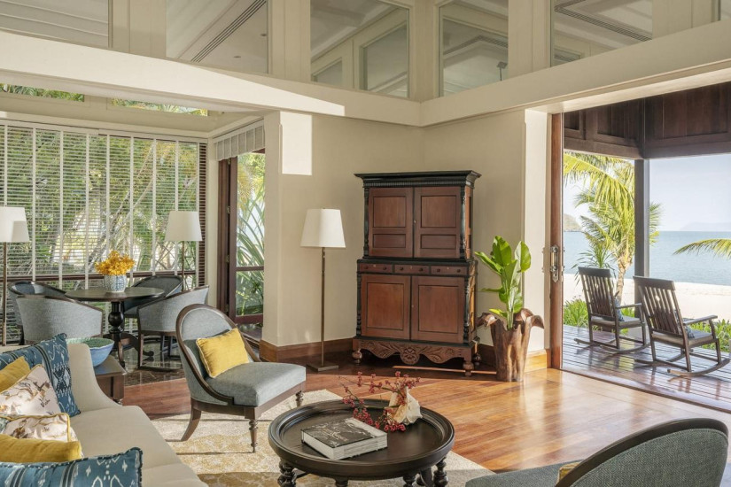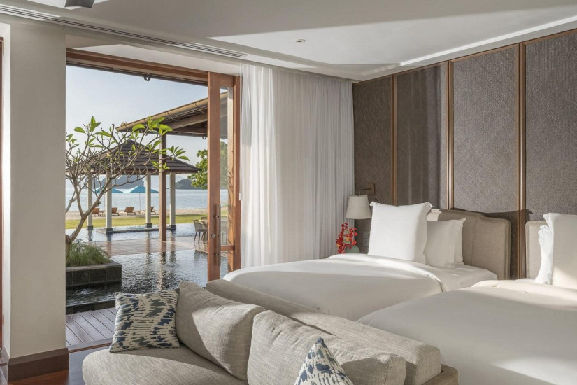 - 226 м2. Состоит из двух спален (с кроватью king-size и двумя кроватями twin), гостиной, гардеробной, двух ванных комнат (одна открытого плана с ванной и душем, вторая – с душем), душа на открытом воздухе, террасы с бассейном, зоной отдыха, обеденной зоной, видом на море и выходом к пляжу. Виллы расположены на пляже в северной части курорта. Максимальное размещение – 4 взрослых.