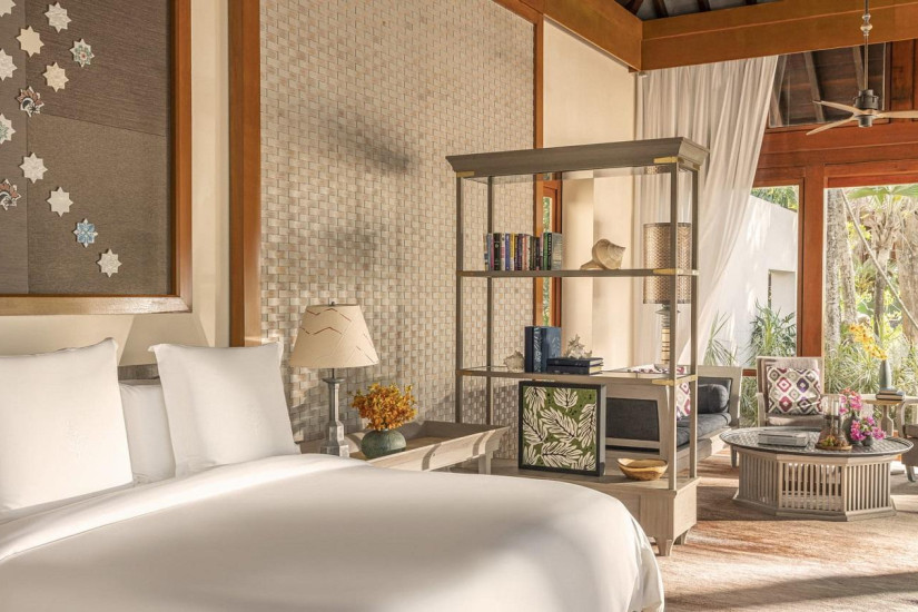 - 590 м2. Состоит из трех спален (с кроватью king-size и двумя кроватями twin), гостиной с обеденной зоной, кухни, гардеробной, трех ванных комнат (две открытого плана с ванной, душем и душем на открытом воздухе, одна – с душем), просторной террасы с 22-метровым бассейном, зонами отдыха, обеденной зоной и частичным видом на сад. Виллы расположены в саду в южной части курорта. Максимальное размещение – 6 взрослых + 2 ребенка.