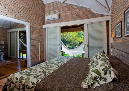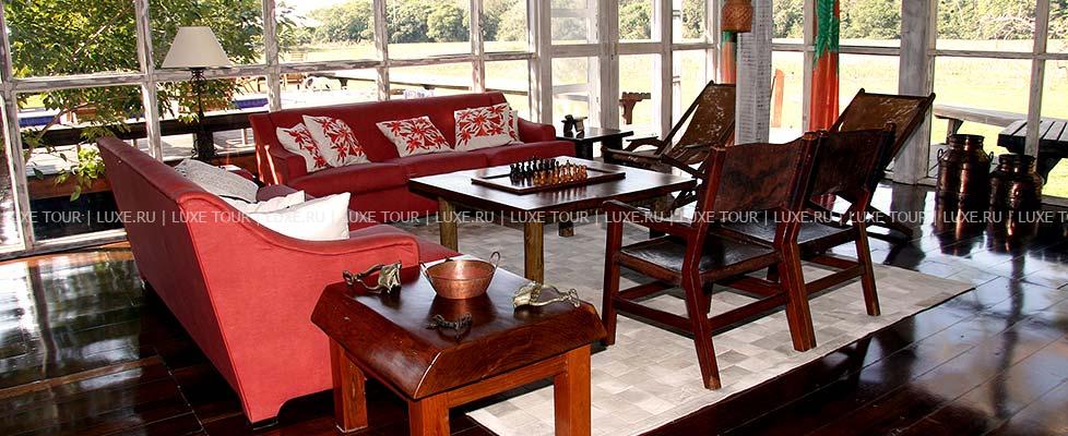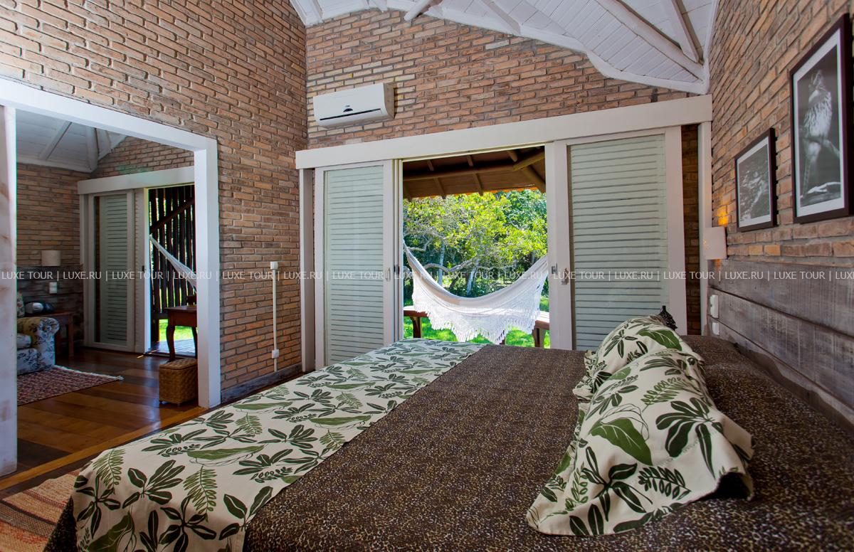 Главное здание Pousada do Rio Mutum, Пантанал, и белые коттеджи с коричневыми крышами, к которым ведут дорожки, выложенные плиткой, построены в традиционном стиле, уютно расположились среди зеленых лужаек и прекрасно приспособлены к влажному климату, когда зимой температура опускается ниже 10 градусов, а летом держится выше 25 градусов по Цельсию. В интерьерах отеля царит истинно эко стиль: высокие деревянные потолки, мягкие ковры сочных натуральных тонов, легкая плетеная и мягкая мебель, светильники, стилизованные под висячие фонари. Стены украшены большими картинами на тропическую тематику. Оригинальный декор, яркая колористическая гамма — все это напоминает об уникальном окружении и радует взгляд своей естественностью.