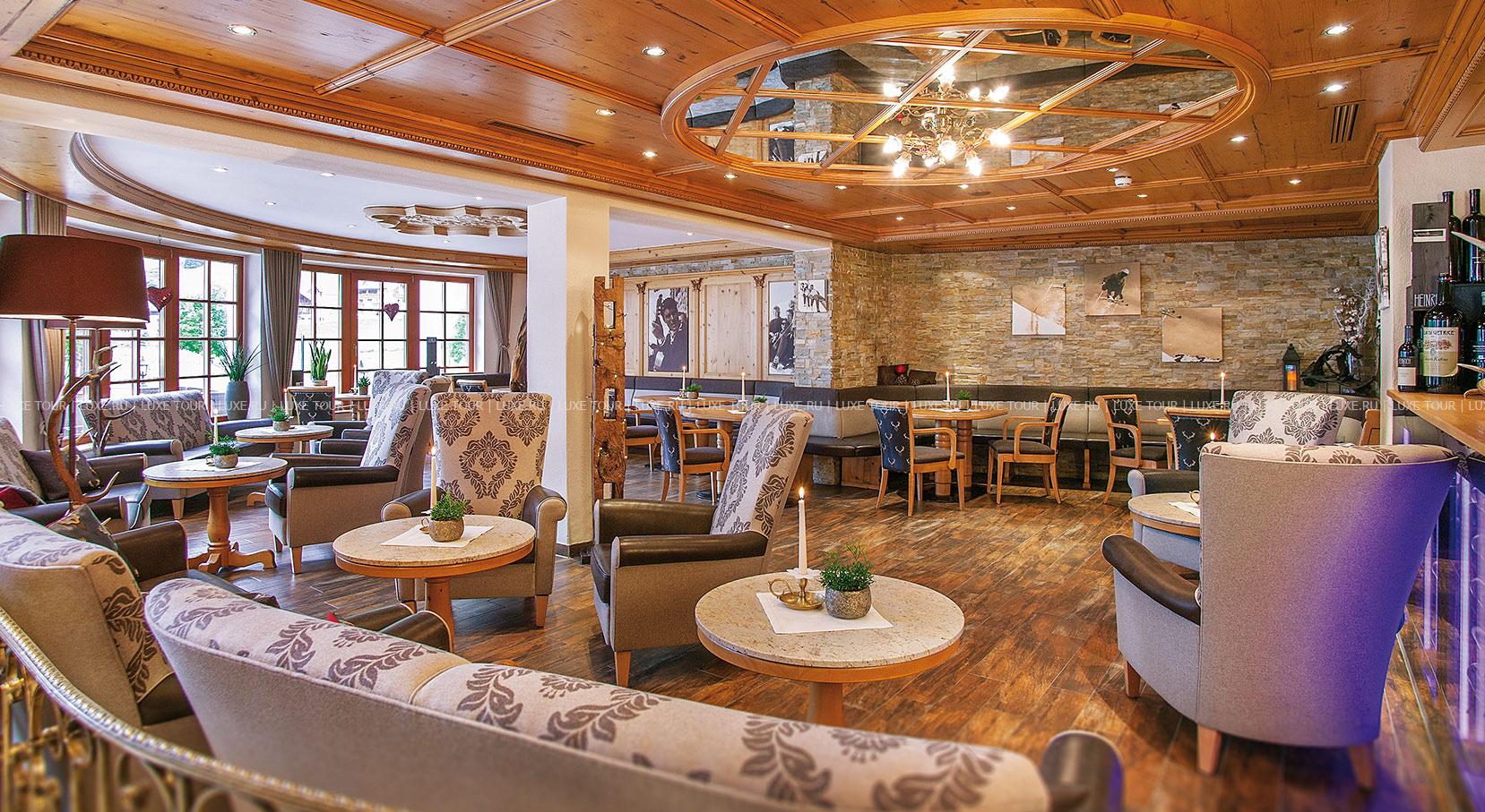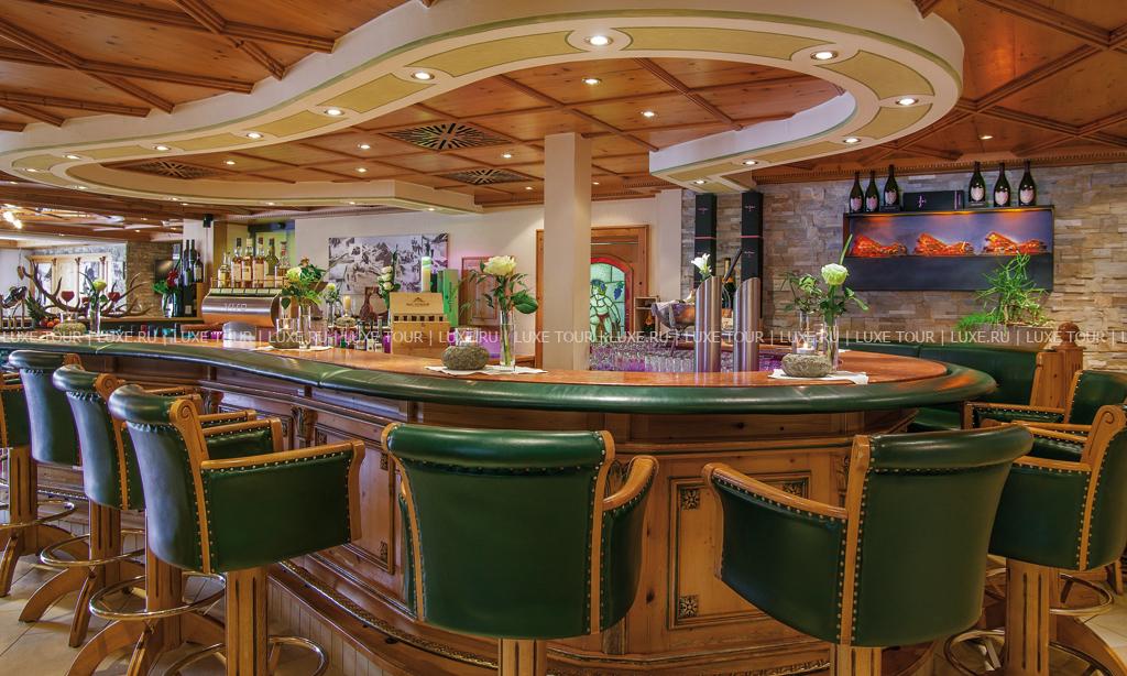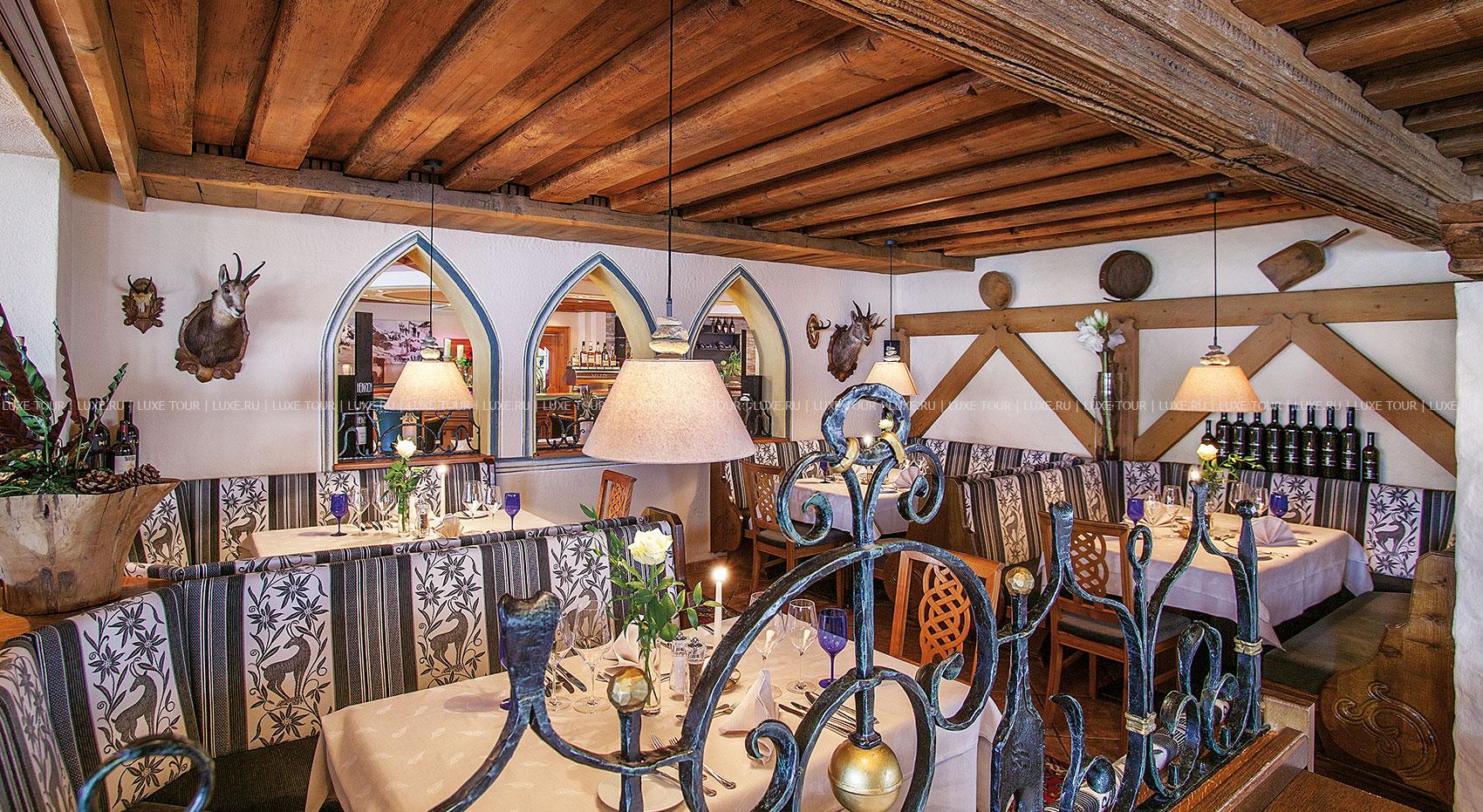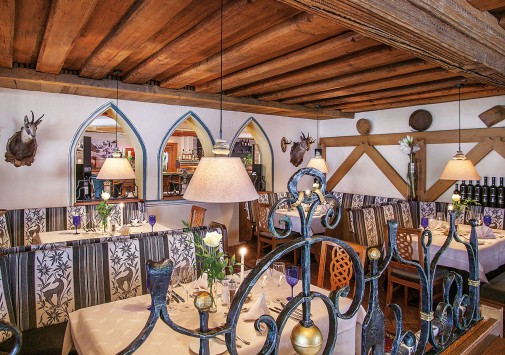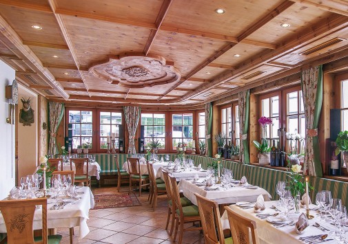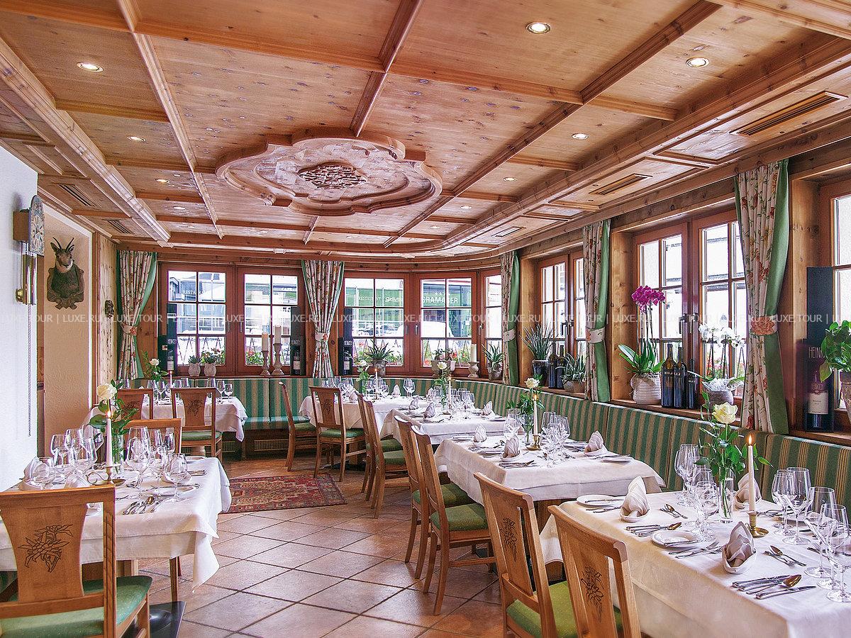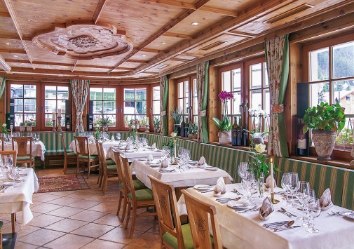 Элегантный ресторан отеля предлагает широкий выбор блюд тирольской, европейской и интернациональной кухни, изысканные ужины a la carte из пяти или шести основных блюд, блюда СПА меню, низкокалорийные и сбалансированные блюда, восхитительную домашнюю выпечку и десерты, а также тематические и гала-ужины, рыбные буфеты и многое другое — на любой гастрономический вкус. Прекрасным дополнением к изысканным блюдам являются вина из собственного винного погреба отеля, где хранится отличная коллекция вин Старого и Нового Света, включая лучшие вина разных регионов Австрии.