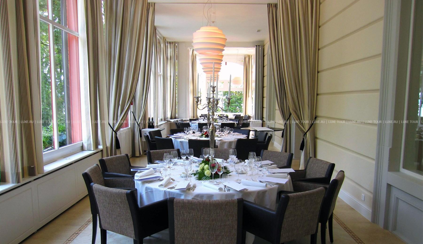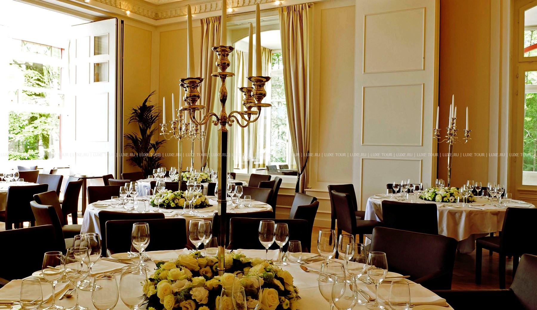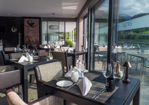 Гастрономический ресторан Sens с уютным залом и террасой над озером предлагает деликатесы из свежайших морепродуктов и рыбы.