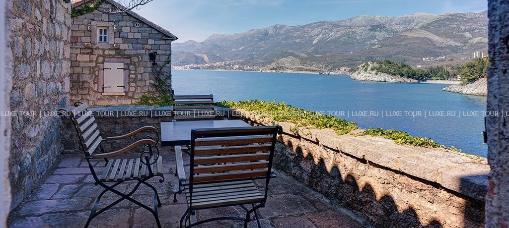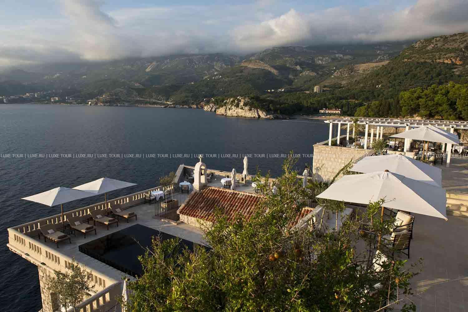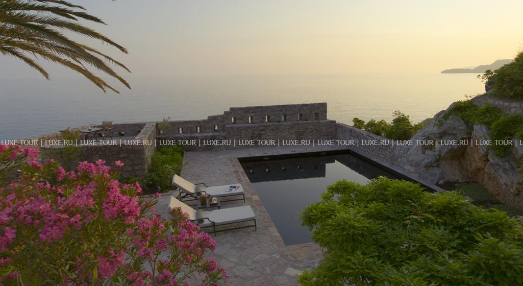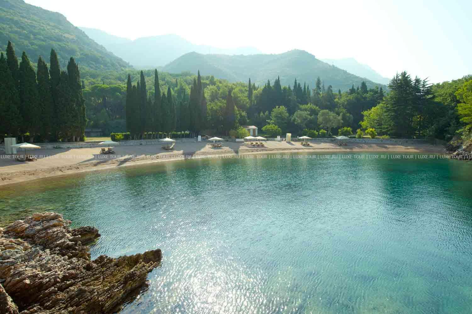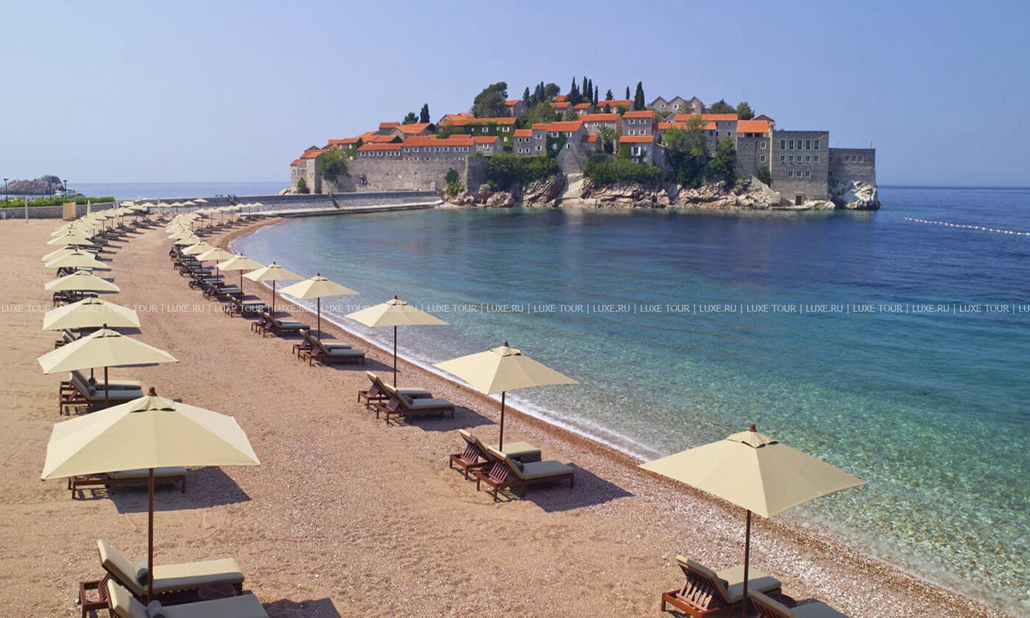 Отелю Aman Sveti Stefan принадлежит прибрежная полоса длиной 2 км, включающая 2 пляжа с розовым песком, — Milocer Beach и знаменитый Queen’s Beach.