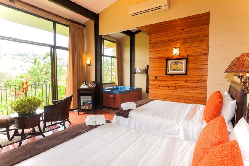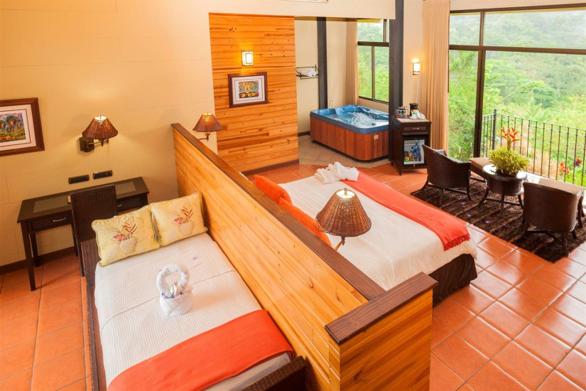 - 63 м2. Состоит из спальни с двумя кроватями queen-size и односпальной кушеткой, идеально подходящей для размещения ребенка, зоны отдыха с обеденным столом, ванной комнаты с джакузи, душем, и двумя раковинами, двух француских балконов с видом на сады и вулкан. Максимальное размещение - 4 взрослых. Возможно объединение номеров.