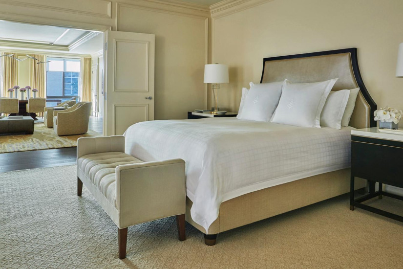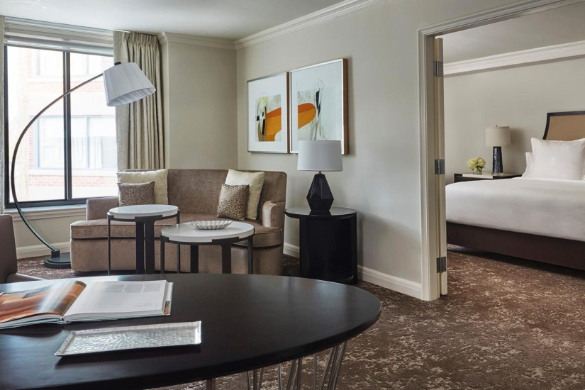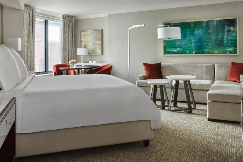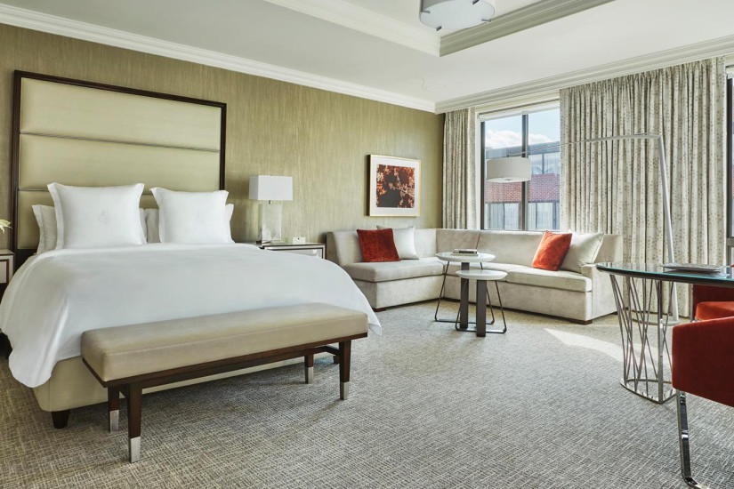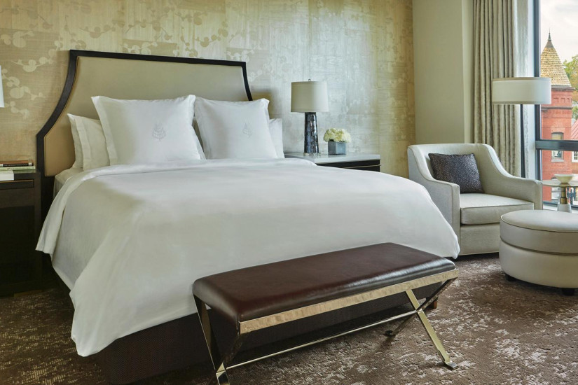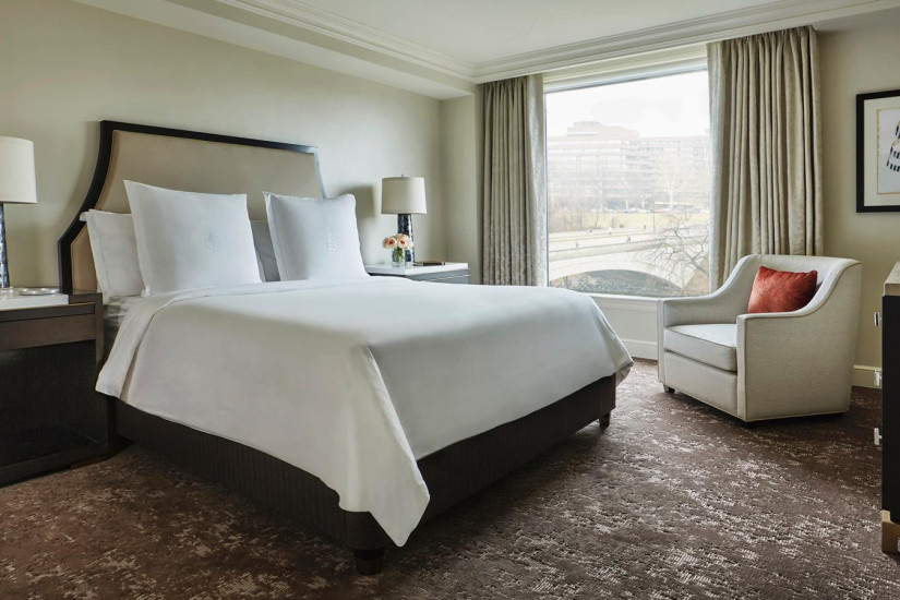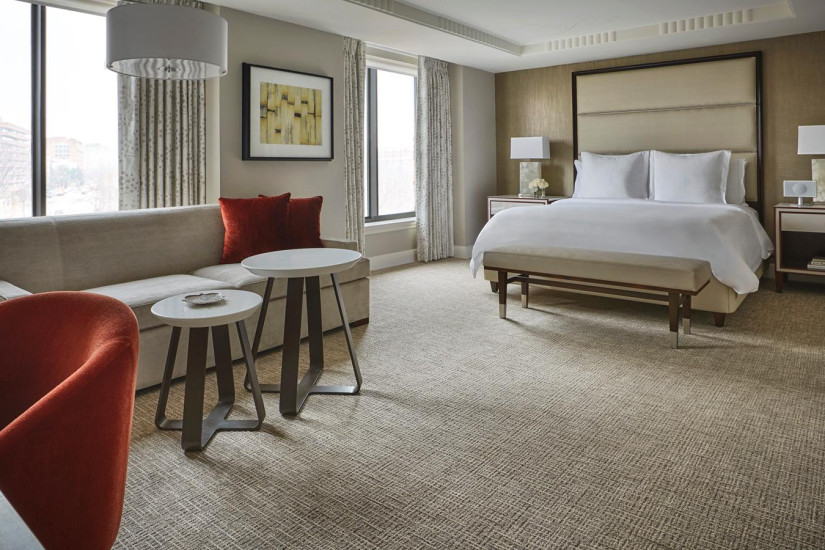 - 58 м2. Состоит из спальни с кроватью king-size или двумя кроватями twin, гостиной зоны, ванной комнаты с ванной и душевой. Из панорамных окон открывается вид на исторический центр района Джорджтаун, внутренний двор с садом или на 29-ю Улицу. Максимальное размещение — 4 взрослых или 2 взрослых + 2 ребенка.