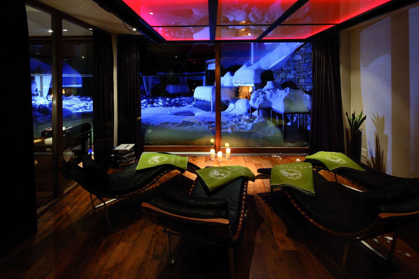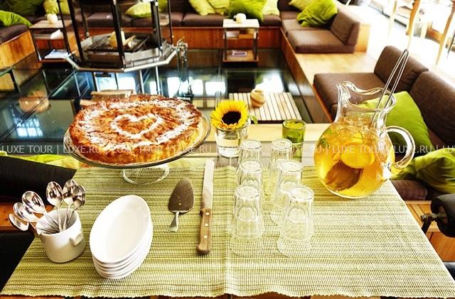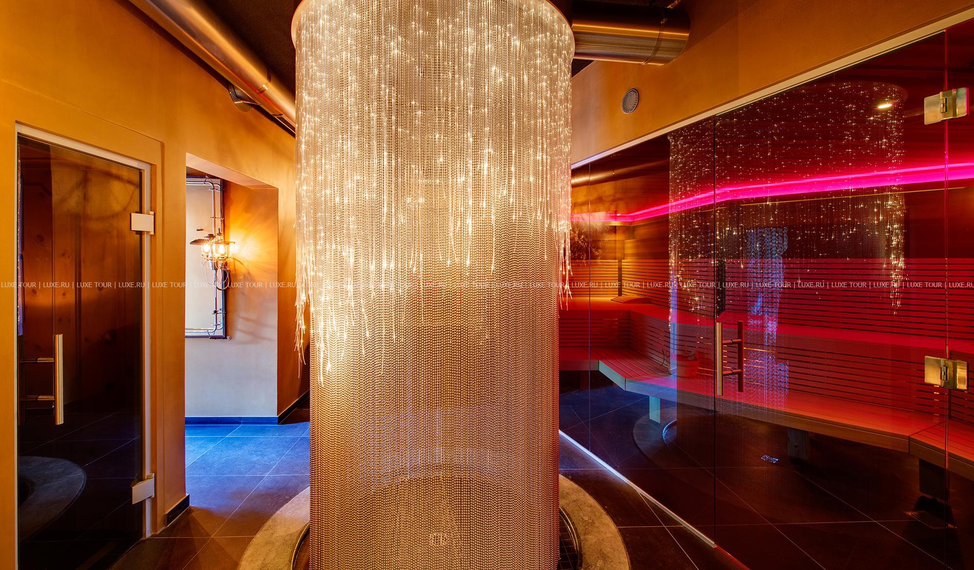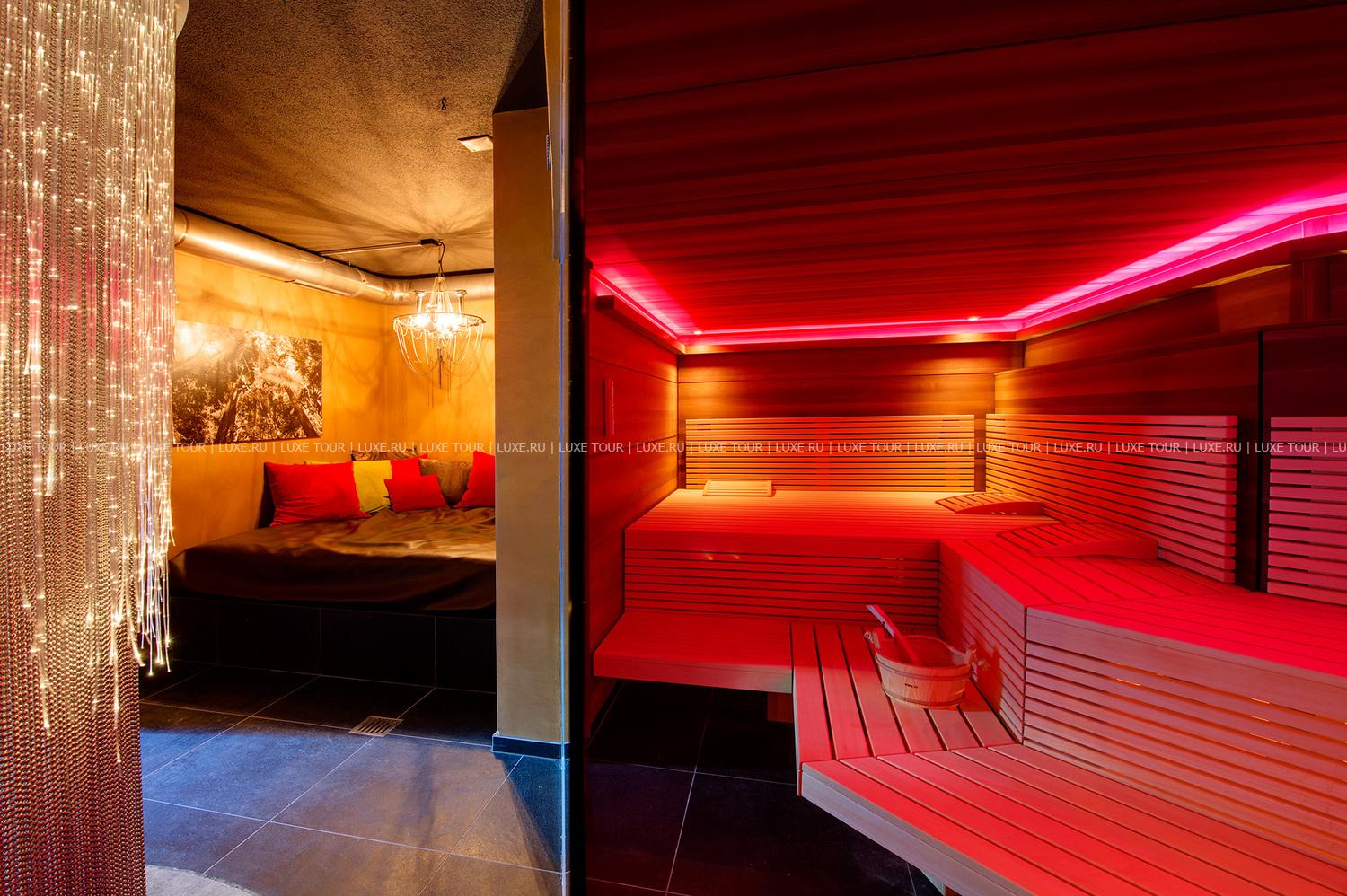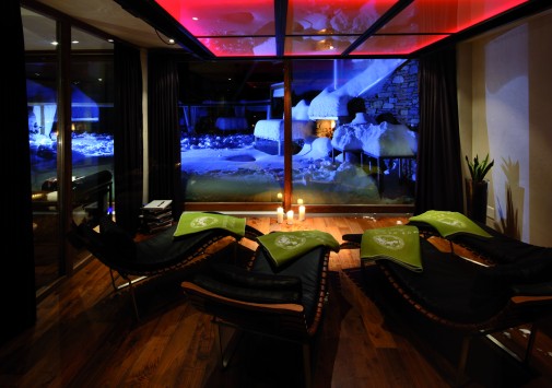 Стильный бар, украшенный оригинальными произведениями швейцарского художника и дизайнера Хайнца Джулена, — уютное место, где можно отдохнуть с бокалом вина или коктейлем на удобном диване у дровяной печи.