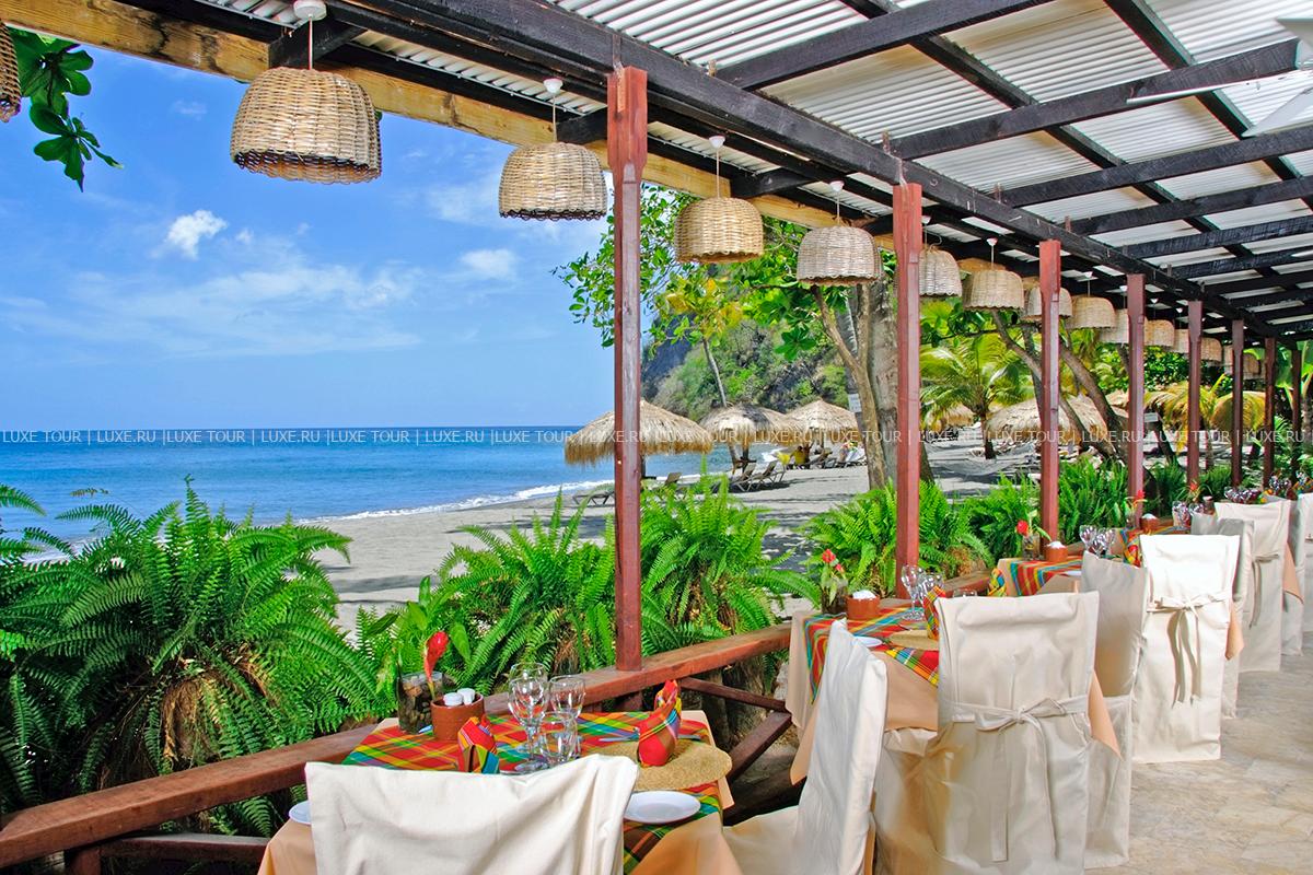 - На открытой террасе элегантного ресторана Treehouse, украшенного произведениями местного искусства, можно отведать блюда карибской кухни и кухню разных тропических стран, а также полюбоваться изумительными пейзажами моря и джунглей. Кроме того, ресторан предлагает вегетарианское меню блюд, приготовленных из экологически чистых натуральных продуктов, произведенных и выращенных на собственной ферме отеля — Emerald Estate, где также произрастают всевозможные тропические фрукты, которые подаются в Anse Chastanet.