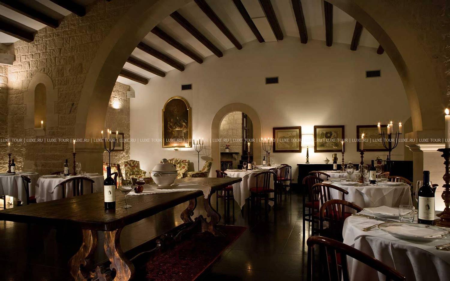 Ресторан Don Eusebio располагается в старинном зале со сводчатыми потолками и живописными полотнами, датируемыми 600-ми годами, и воссоздает атмосферу трапезной эпохи рыцарей Мальтийского ордена. Гостей Eremo della Giubiliana Сицилия здесь ждет изысканная средиземноморская кухня и традиционные региональные блюда, приготовленные по древним рецептам из отборных местных продуктов — фокаччо с грибами, паста, домашний хлеб. Буфеты завтраков сервируют в уютном уголке рядом со стеклянными дверями, откуда открывается чудесный вид на старинный парк, оливковую рощу и виднеющийся вдали лазурный морской горизонт.