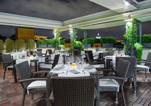 Очаровательная терраса летнего Roof Top Lounge Bar, расположенная на крыше отеля St. George Roma, — идеальное место для отдыха с аперитивом или коктейлем, откуда можно полюбоваться панорамой Вечного города.