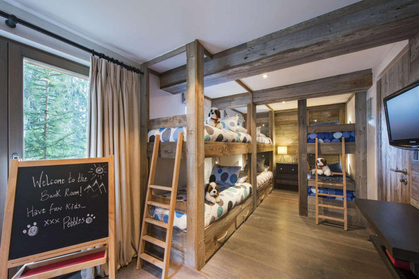 Детская комната расположена на первом этаже, и в ней могут разместиться шесть маленьких детей. В ней имеется душевая кабина, плазменный телевизор с DVD-проигрывателем, игровая приставка и пуфы-груши.