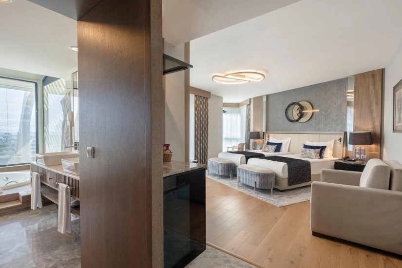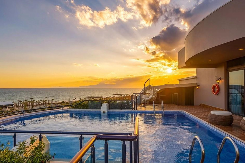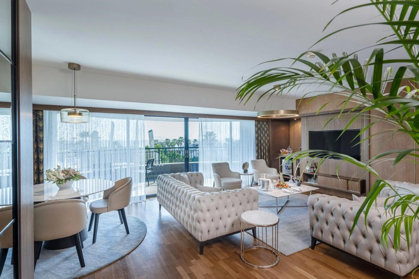 - 420 м2. Роскошный номер, расположенный на верхнем этаже главного здания, включает просторную гостиную с обеденной зоной и американским баром, две спальни (одна-для детей) с ванным комнатами (одна — с джакузи), огромную террасу с бассейном и панорамным видом на море. Максимальное размещение - 4 взрослых и 1 ребенок.