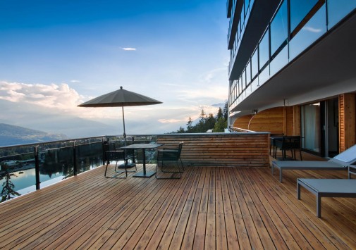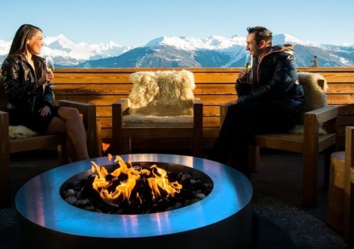 Открытая солнечная терраса, где подаются легкие закуски, фондю и разнообразные напитки — прекрасное место для отдыха apre-ski.