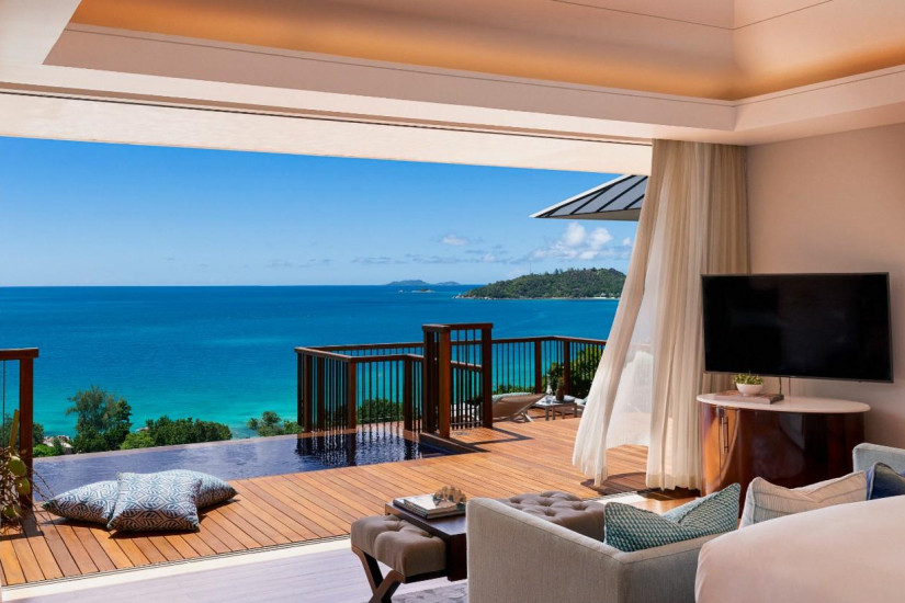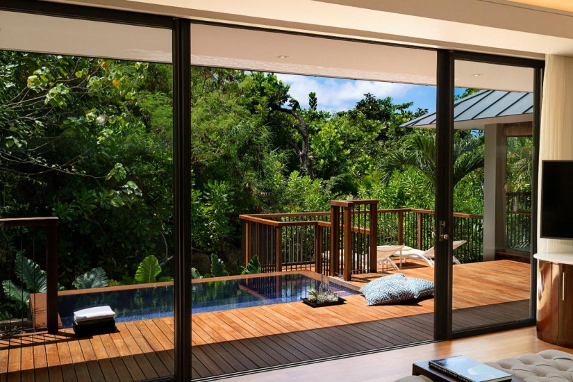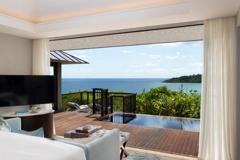 - 125 м2. Выходит на океан и остров Curieuse, включает спальню с кроватью king-size или queen-size, гардеробную, ванную комнату, террасу с персональным бассейном и зоной отдыха, душ на открытом воздухе, открытый павильон под навесом с обеденной зоной. Максимальное размещение — 2 взрослых и 2 ребенка (второй ребенок не во всех номерах, только по запросу).