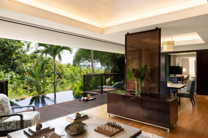 - 200 м2. Расположена на вершине холма и имеет потрясающий панорамный вид на океан и сады, включает спальню с кроватью king-size, гардеробную, гостиную, ванную комнату с видом на океан, террасу с персональным бассейном и зоной отдыха, душ на открытом воздухе, открытый павильон под навесом с обеденной зоной и площадкой для барбекю. Максимальное размещение — 2 взрослых и 2 ребенка или 3 взрослых (второй ребенок не во всех номерах, только по запросу).