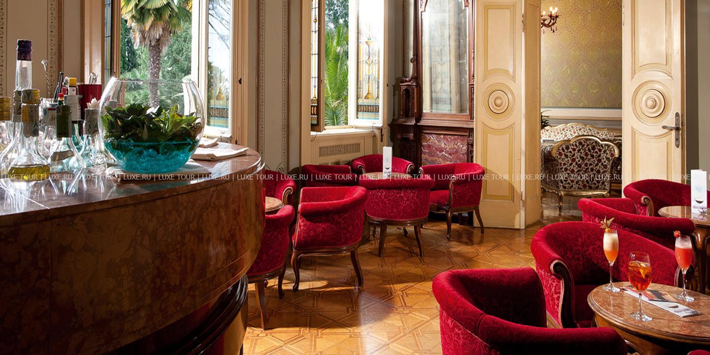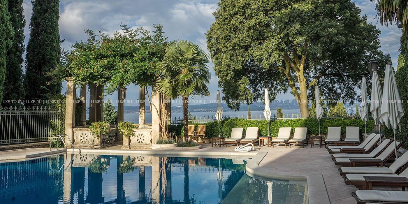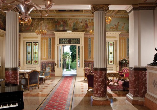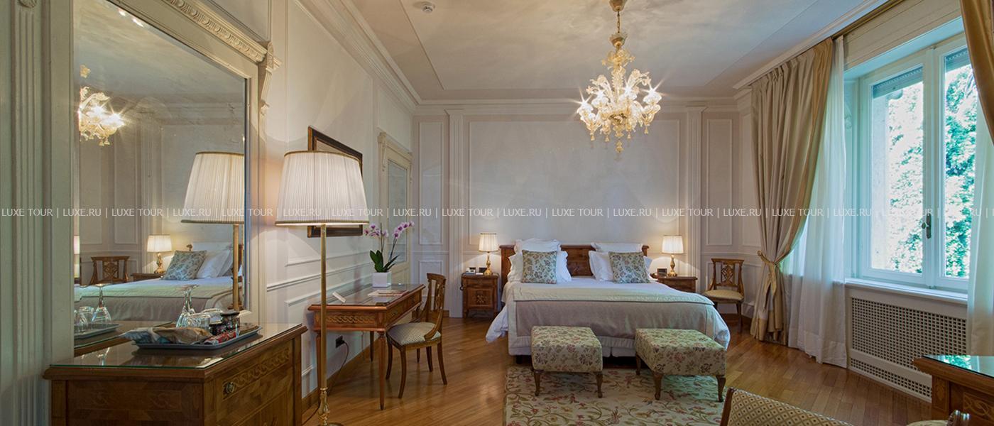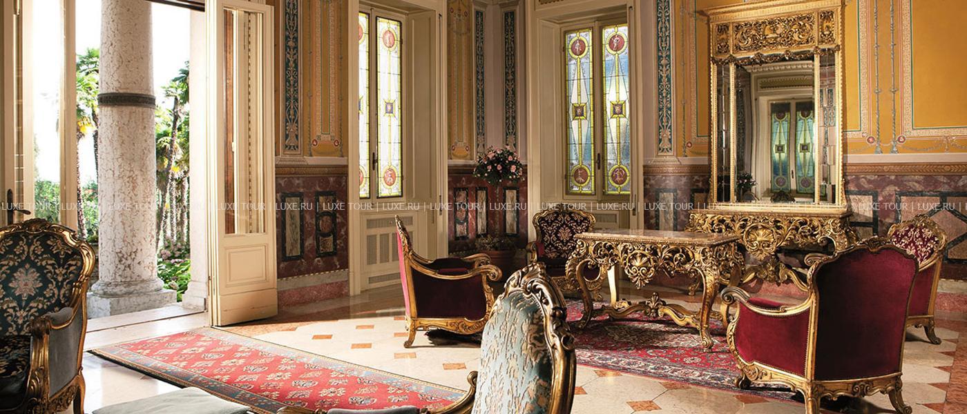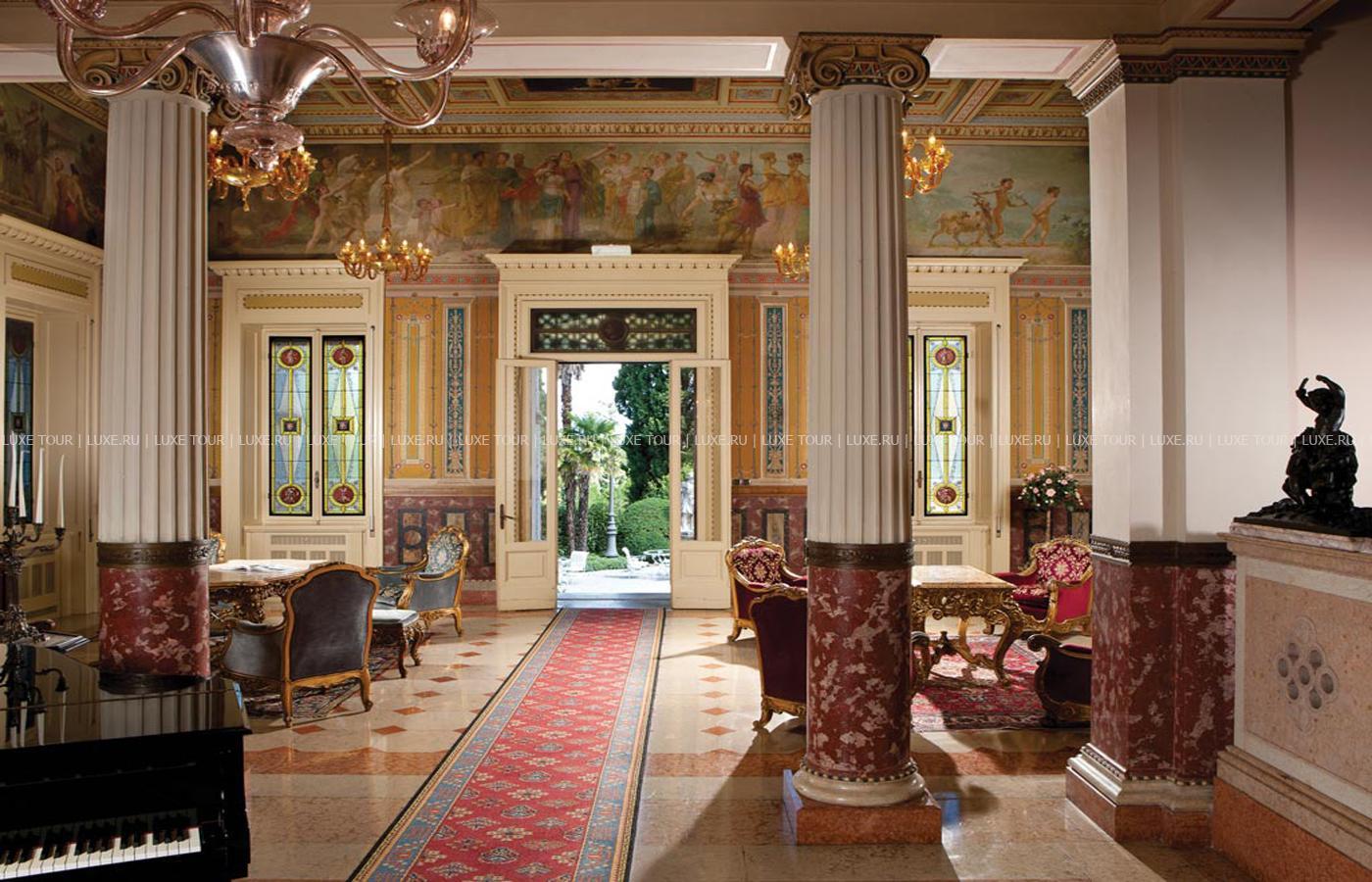 Известный ценитель итальянского искусства герцог Козериц стремился стилизовать интерьеры своего жилища под роскошные дворцы классической Италии. Следы этой концепции легко заметить и в наше время: интерьеры холлов отделаны веронским мрамором, украшены античными колоннами, уникальными росписями и мозаиками. Органичной частью гостиничного комплекса предстает огромный парк, где находятся римские развалины, скульптуры, а также главная гордость отеля – обыгрывающие различные мифологические сюжеты скульптурные композиции фонтанов, являющиеся подлинными произведениями искусства. В отеле есть открытый бассейн, теннисный корт, собственный пляж на берегу озера, ресторан, коктейль-бар и бар-барбекю.