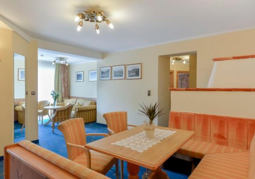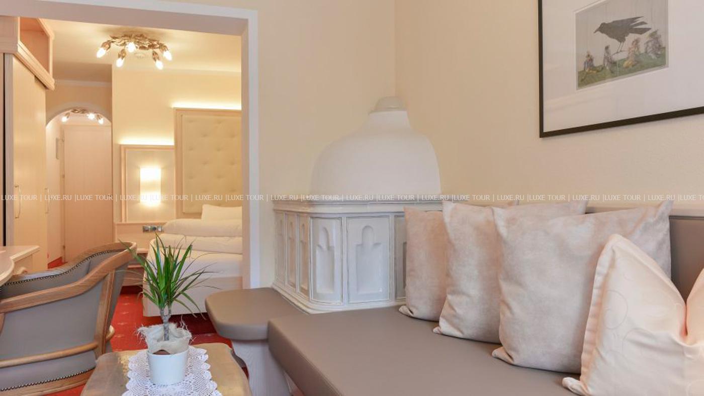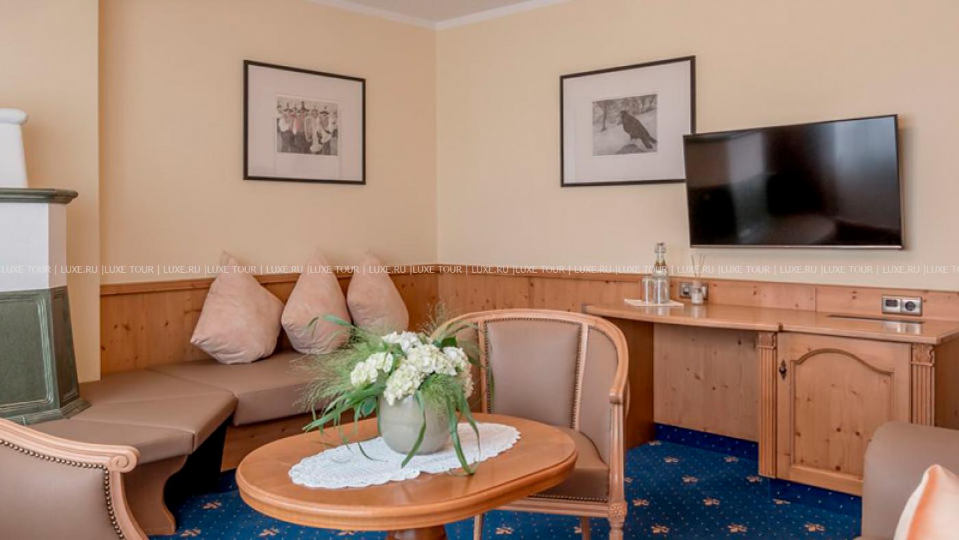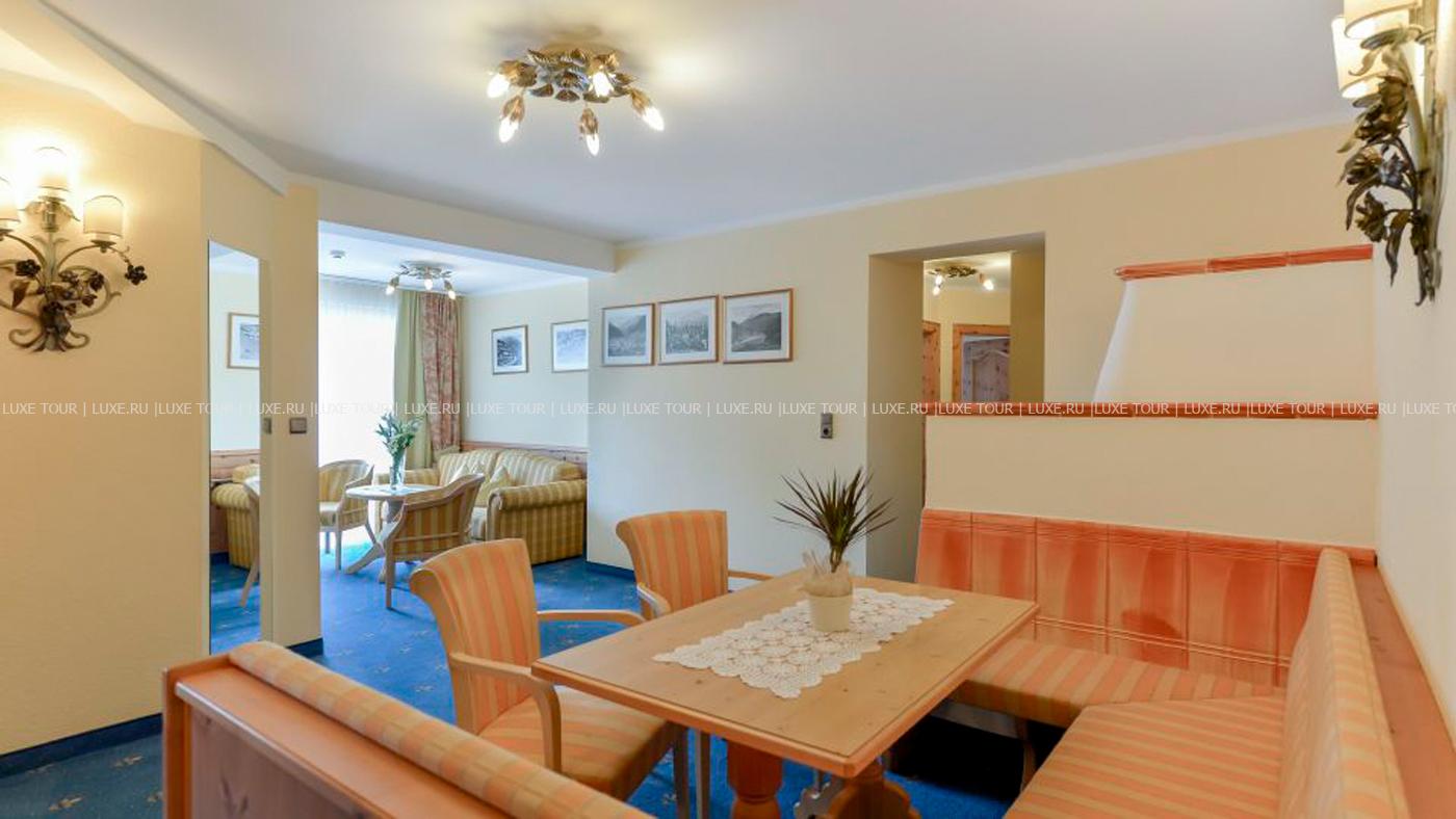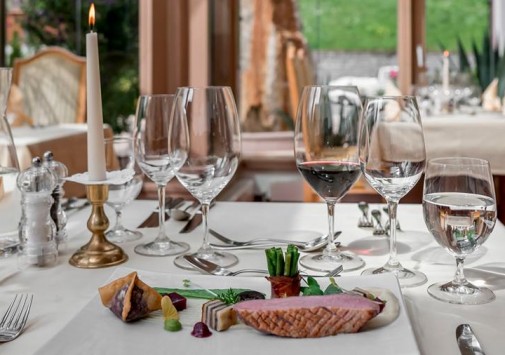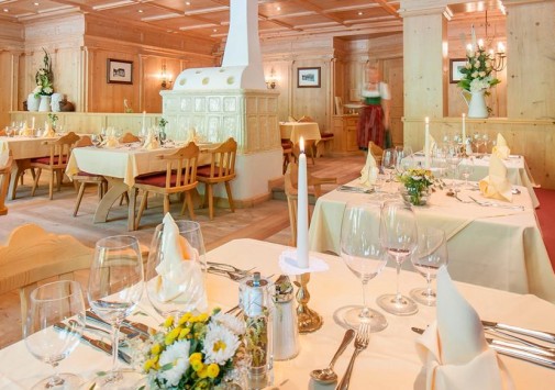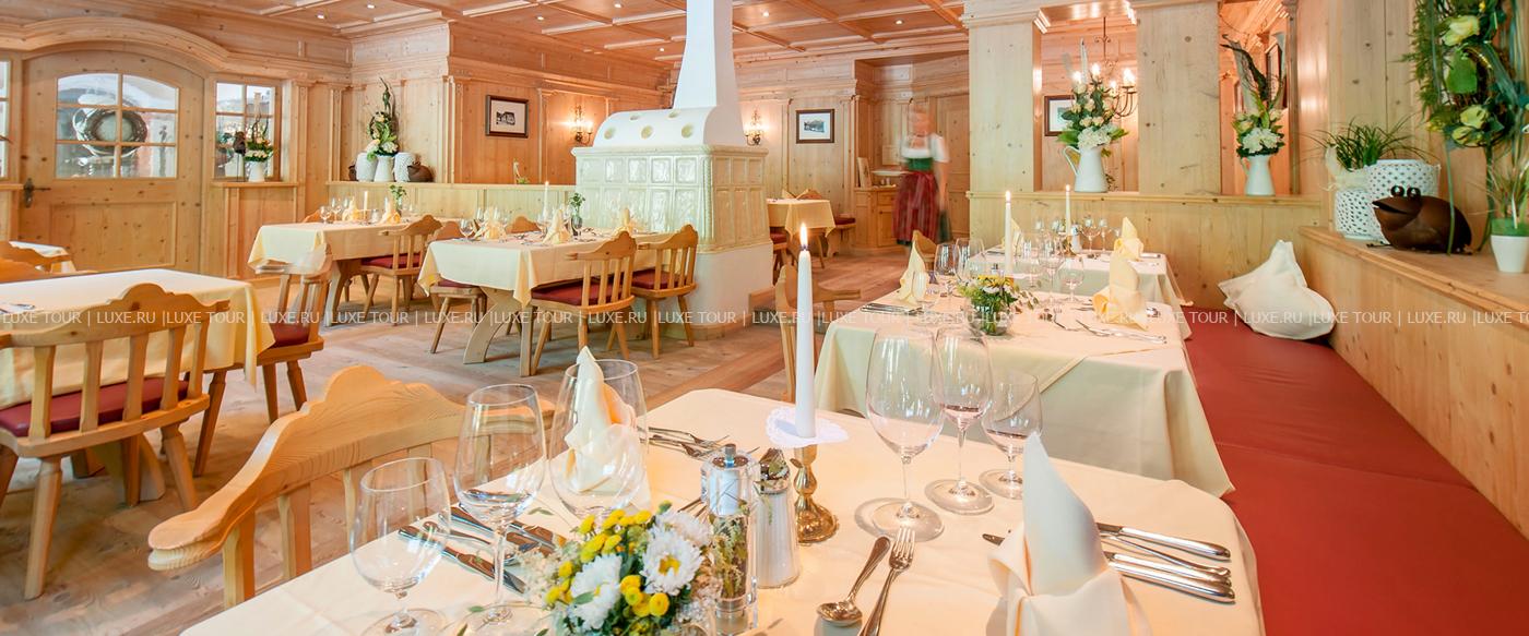 - В элегантном ресторане отеля, отделанном деревом, с панорамными окнами, откуда открывается чудесный вид на горы, большой тирольской печью, предлагается разнообразие блюд тирольской и международной кухонь.