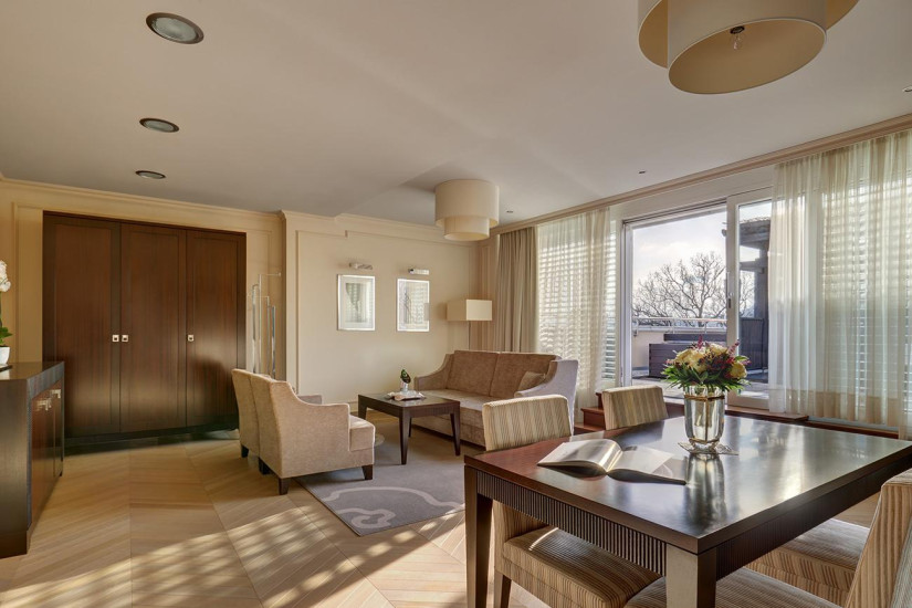 - 40 м2 + терраса 230 м2. Роскошный номер состоит из спальни, гардеробной, ванной комнаты с ванной и душем, просторной террасы с подогреваемой джакузи, финской сауной, обеденной зоной, зоной отдыха и великолепным панорамным видом на парк и лес. Номер расположен на верхнем этаже. Максимальное размещение – 2 человека.