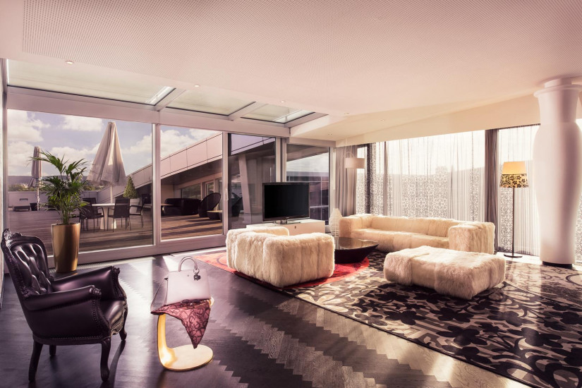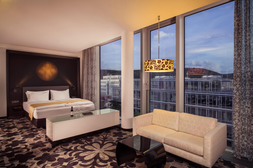 - 55 м2. Состоит из спальни с кроватью king-size, отдельной гостиной, рабочей зоны с факсом, цветным принтером и письменными принадлежностями, ванной комнаты с ванной и отдельным душем, террасы с видом на Рейн. В гостиной возможно размещение стола для проведения переговоров. Максимальное размещение - 4 человека. Возможно объединение с другим номером Hero Suite.