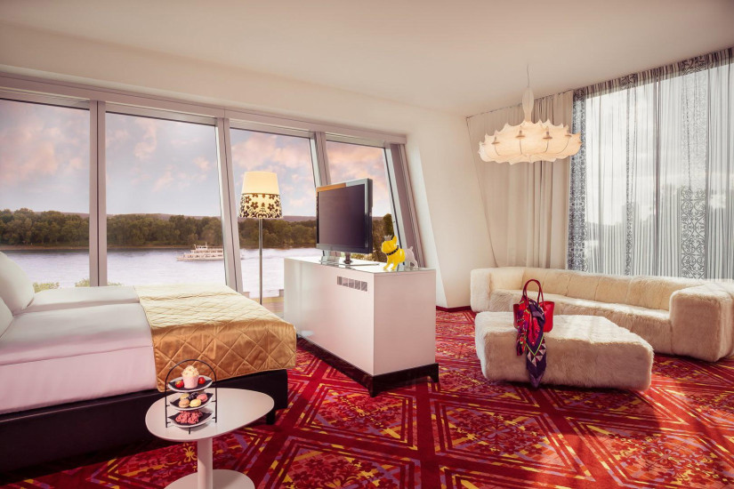 - 55 м2. Номер, посвященный великому композитору, состоит из спальни с кроватью king-size, зоны отдыха с баром и роялем фмрмы Blüthner, рабочей зоны, ванной комнаты с ванной и отдельным душем. Имеет панорамный вид на Рейн. Максимальное размещение - 3 человека. Возможно объединение с номером Corner Suite.