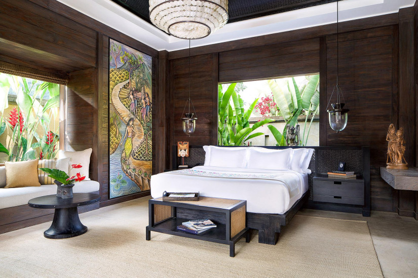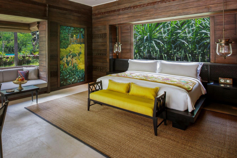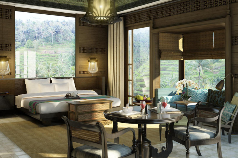 - 100 м2. Состоит из спальни с кроватью king-size или двумя кроватями twin, гостиной, ванной комнаты с отдельно стоящей овальной ванной, «ливневым» душем и двухсекционной раковиной, гардеробной, террасы с зоной отдыха и видом на рисовые поля и тропический лес. Размещение – 2 взрослых. Возможны смежные номера.
