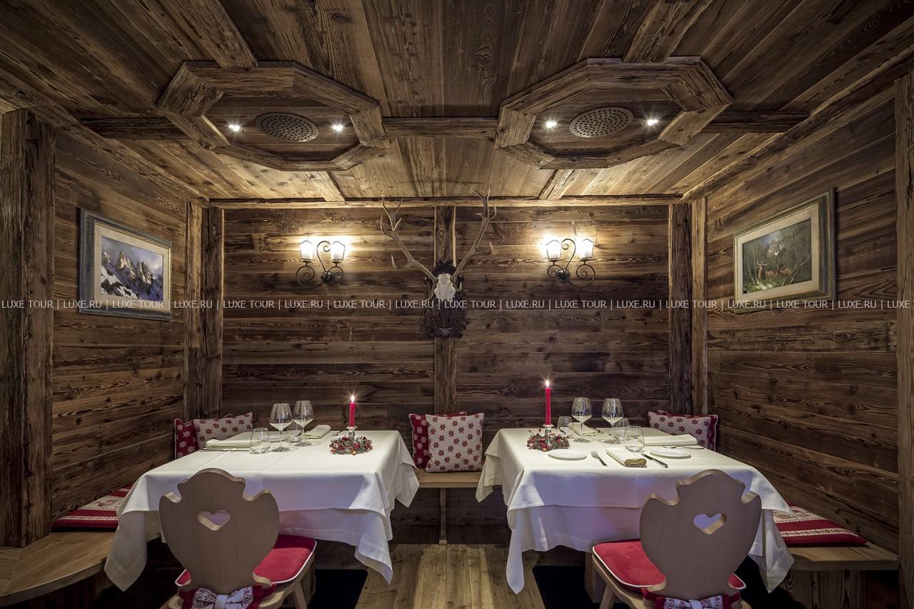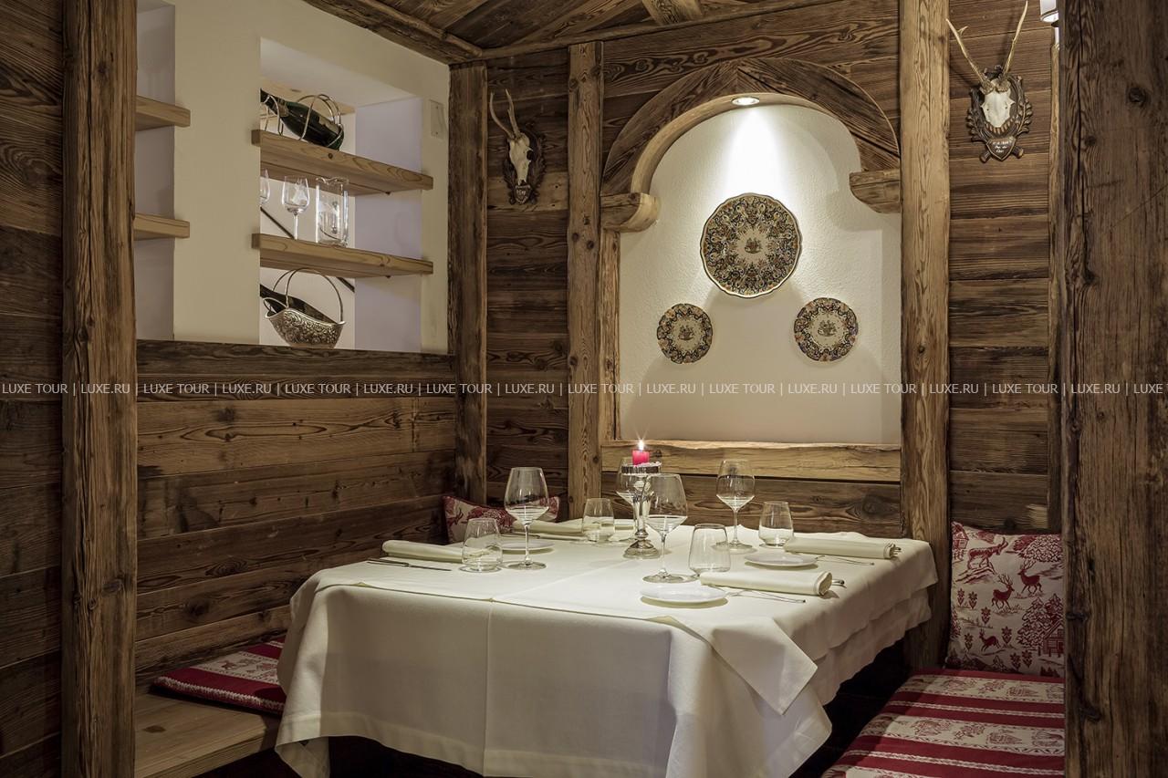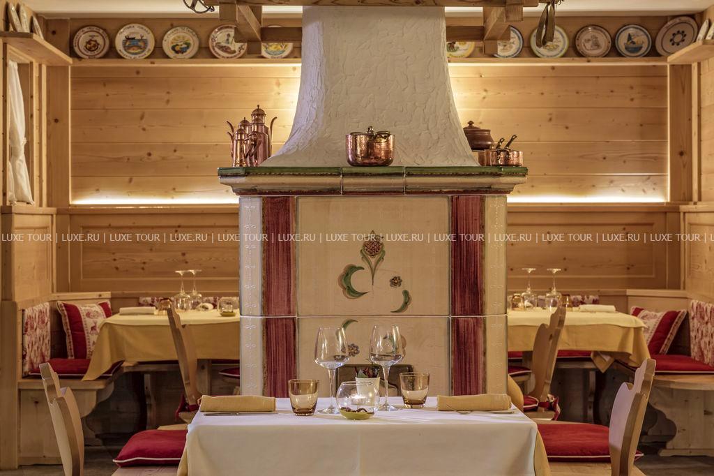 Эксклюзивная изразцовая печь, расписанная вручную, натуральные материалы, забота об освещении и элегантный штрих в деталях и обстановке придают ресторану Due Pini класс и индивидуальность, типичные для горных заведений. Окруженные теплом этой магической атмосферы, вы сможете наслаждаться кухней, которая следует региональной трентинской традиции, но в то же самое время пересматривается в оригинальном и мудром ключе, всегда используя отборные местные ингредиенты.